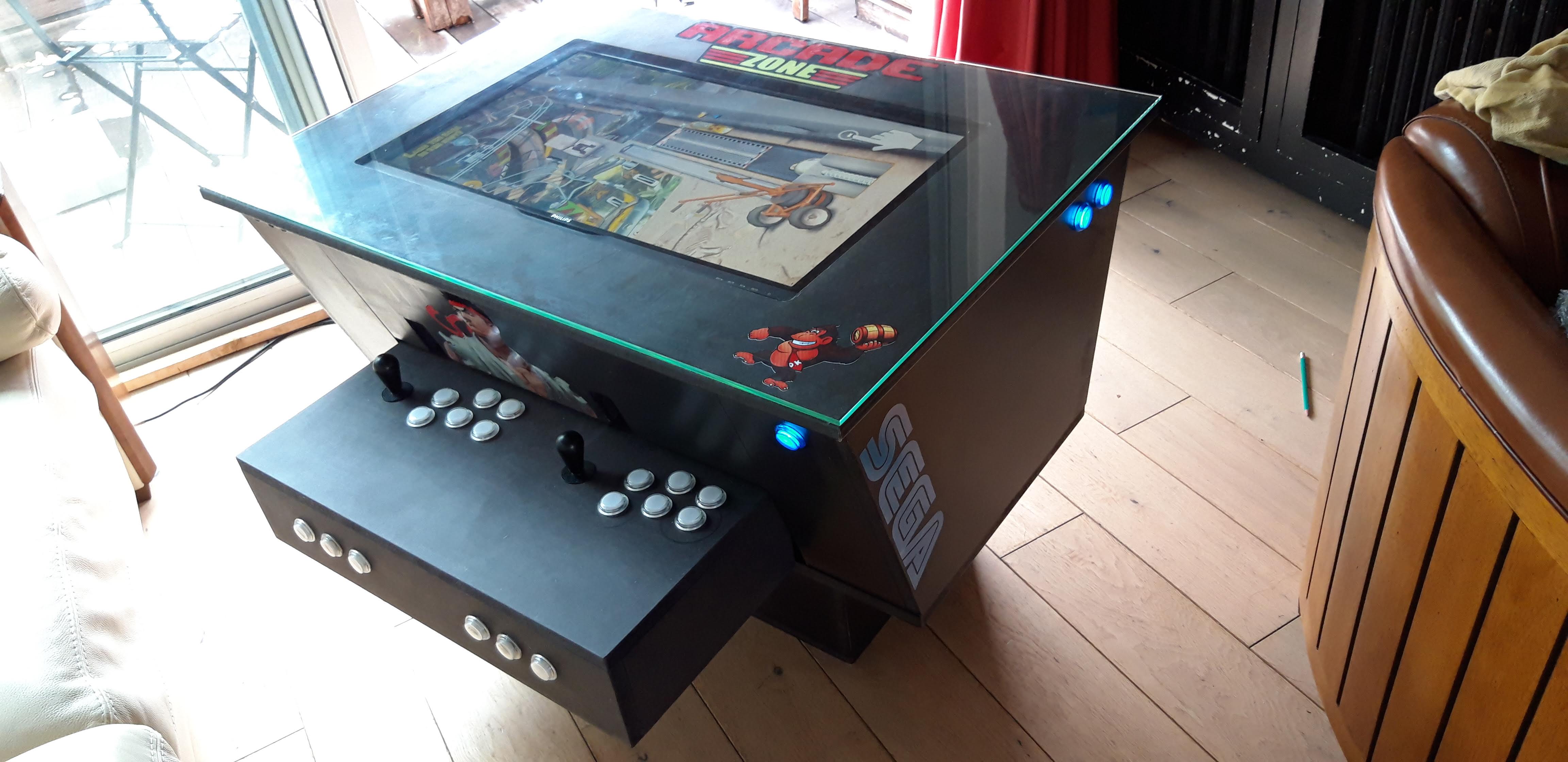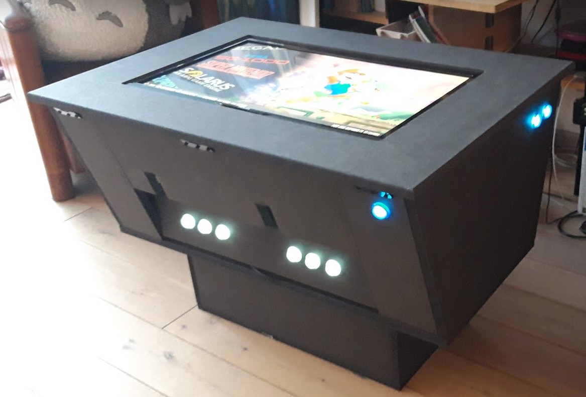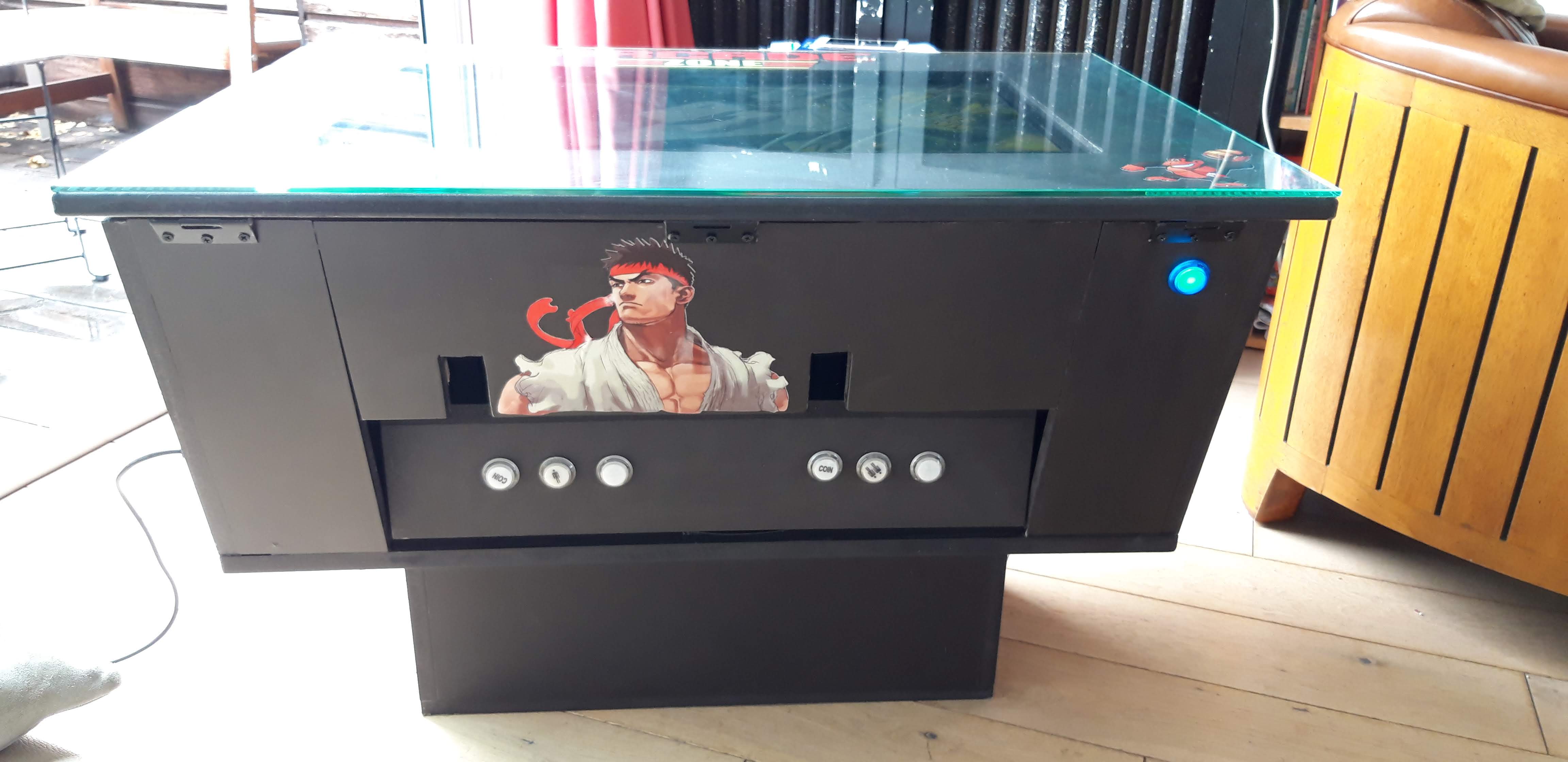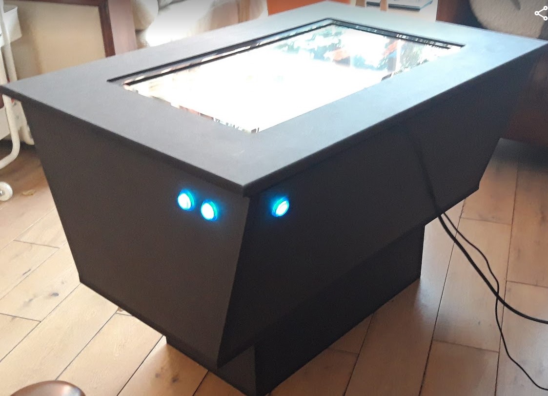 sympas, j'adore les projet comme ca. Petit conseil, tu devrai te faire un plateau supérieur en bois a poser sur la partie écran pour pouvoir utiliser la table sans craintes, j'ai fait un truc du genre avec écran dans un bar protégé par un plexi mais et je regrette car quand quelqu'un pose un bol de cacahuètes ou un verre dessus je peu pas m'empêcher de grincer des dent en pensant au nouvelles rayures...