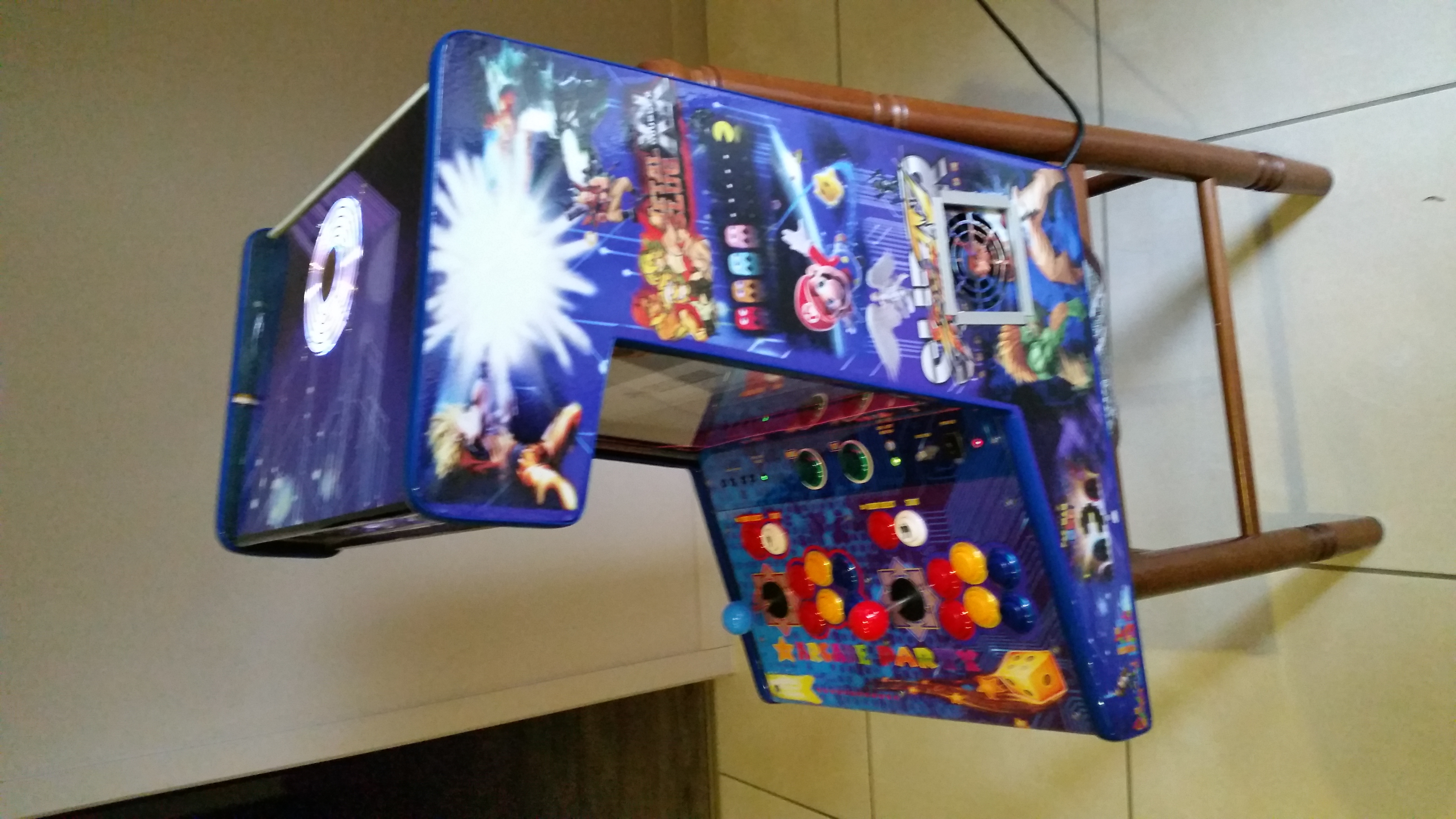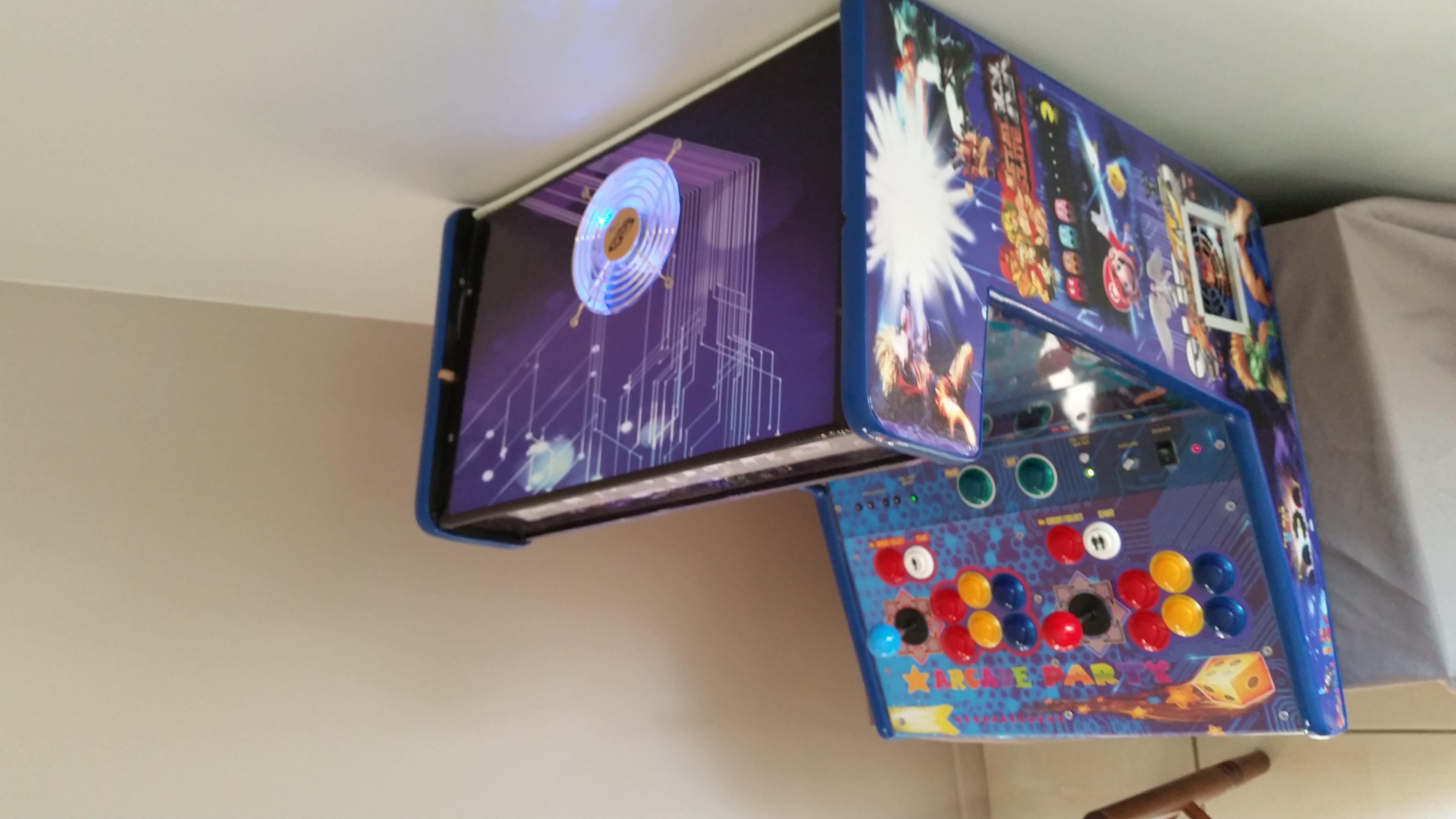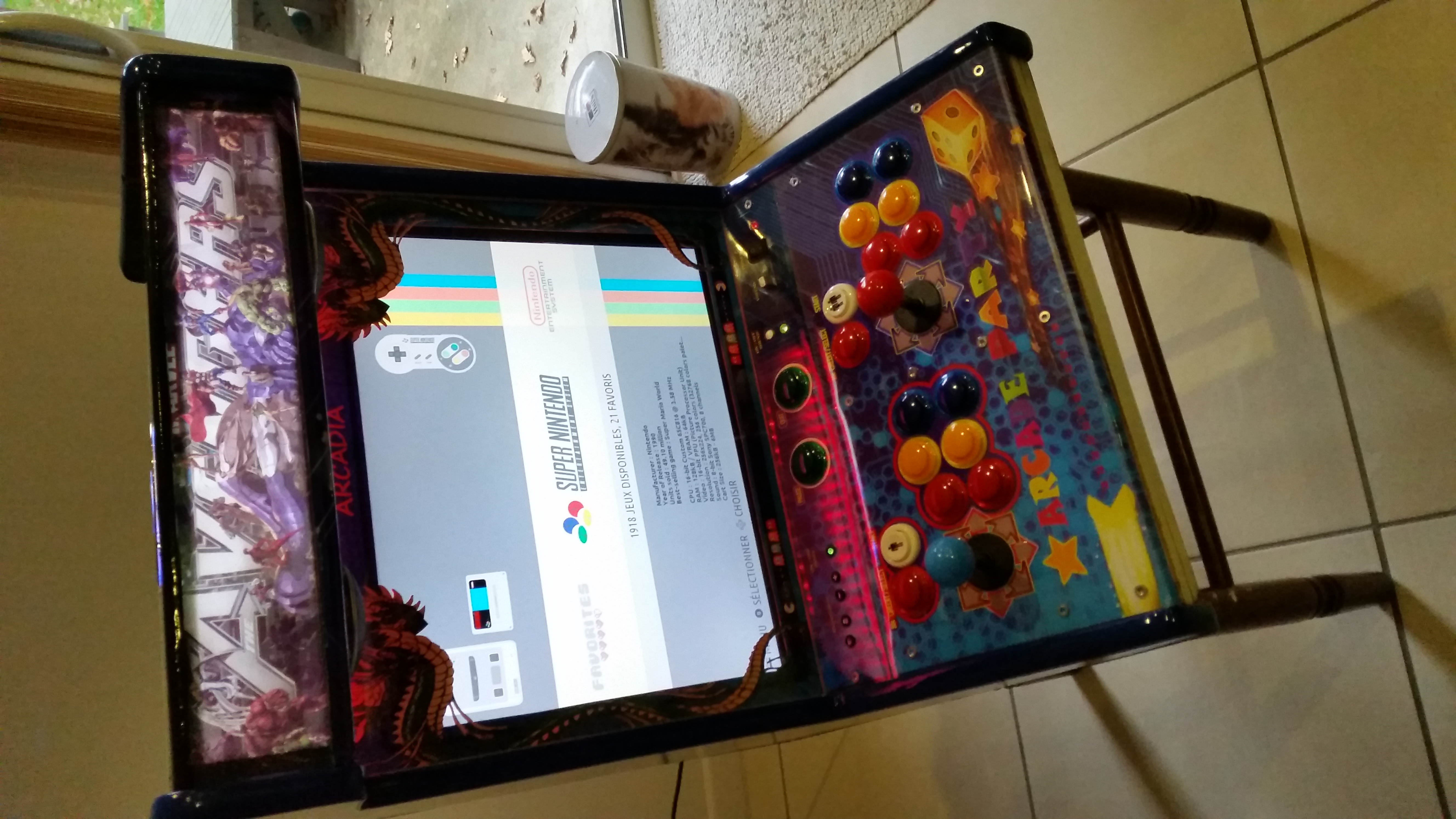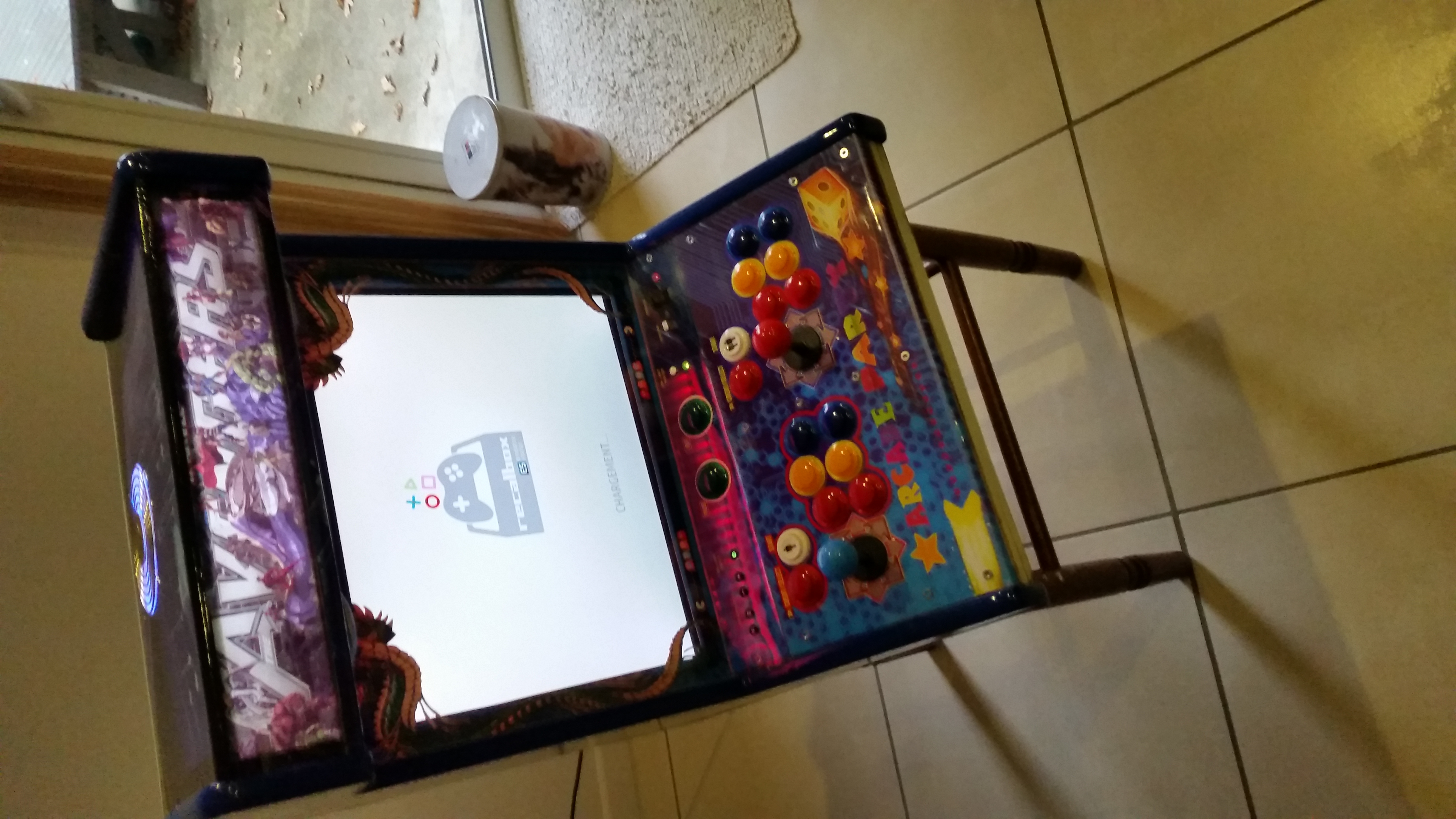 salut je mets les photos un peu ancienne du 1 er Bartop (posé sur une chaise...) fait pour mon fil il y a quelques années avec 1 RPI et recalbox , toujours en action!