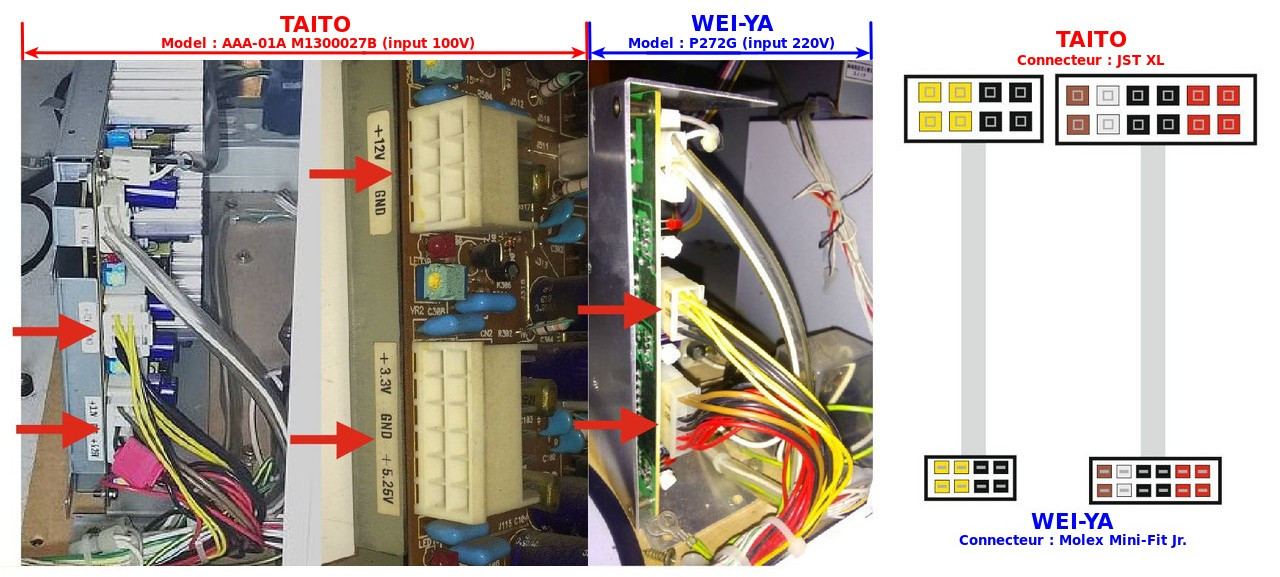Car j'ai remplacé la PSU TAITO d'origne par une PSU Wei Ya 220v (prévu pour une Vewlix).