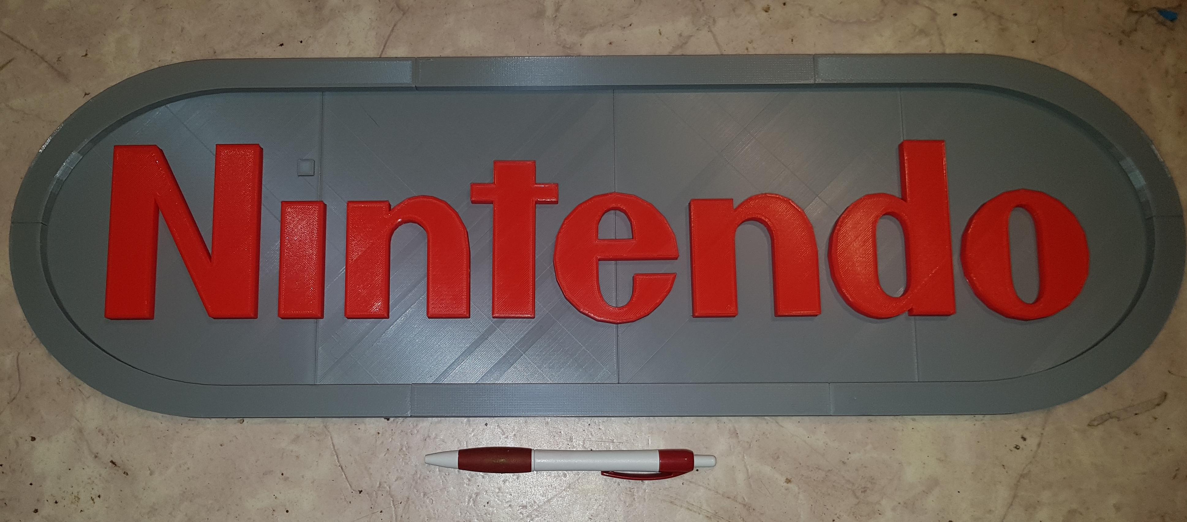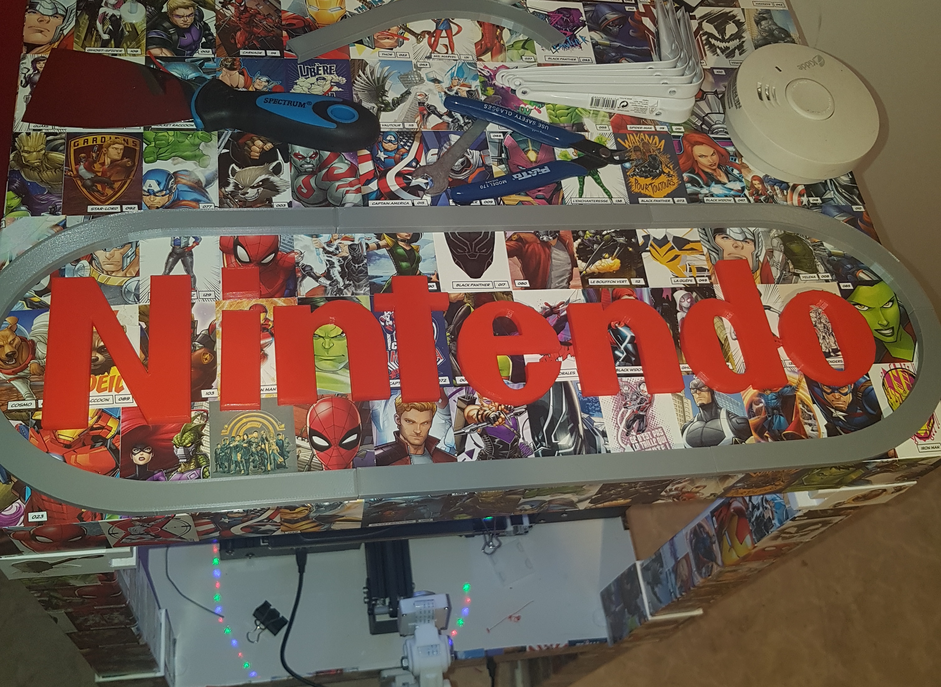 Les pièces en 3D s'imprime doucement mais sûrement ! Faut dire que j'ai fais le gros bourrin avec le logo Nintendo de 58 x 18 cm. Le lettrage est déjà sorti du plateau, j’enchaîne sur le contour, puis enfin la base massive. Je partagerais l'intégralité des fichiers une fois imprimer et tester.