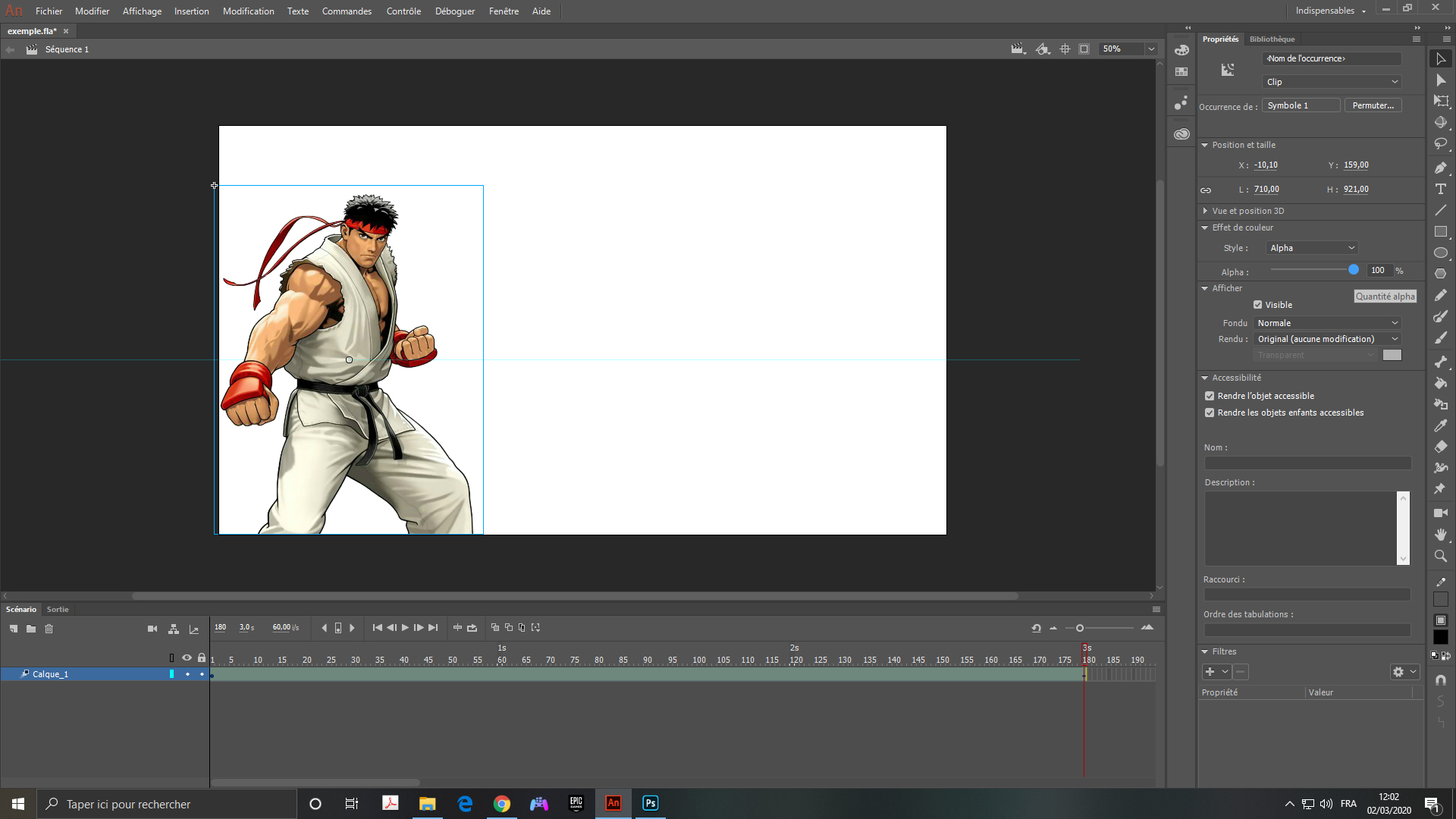 Une fois votre nouveau document crée, glisser votre sur image sur la fenêtre Animate, et positionner le RYU hors écran, comme ceci.