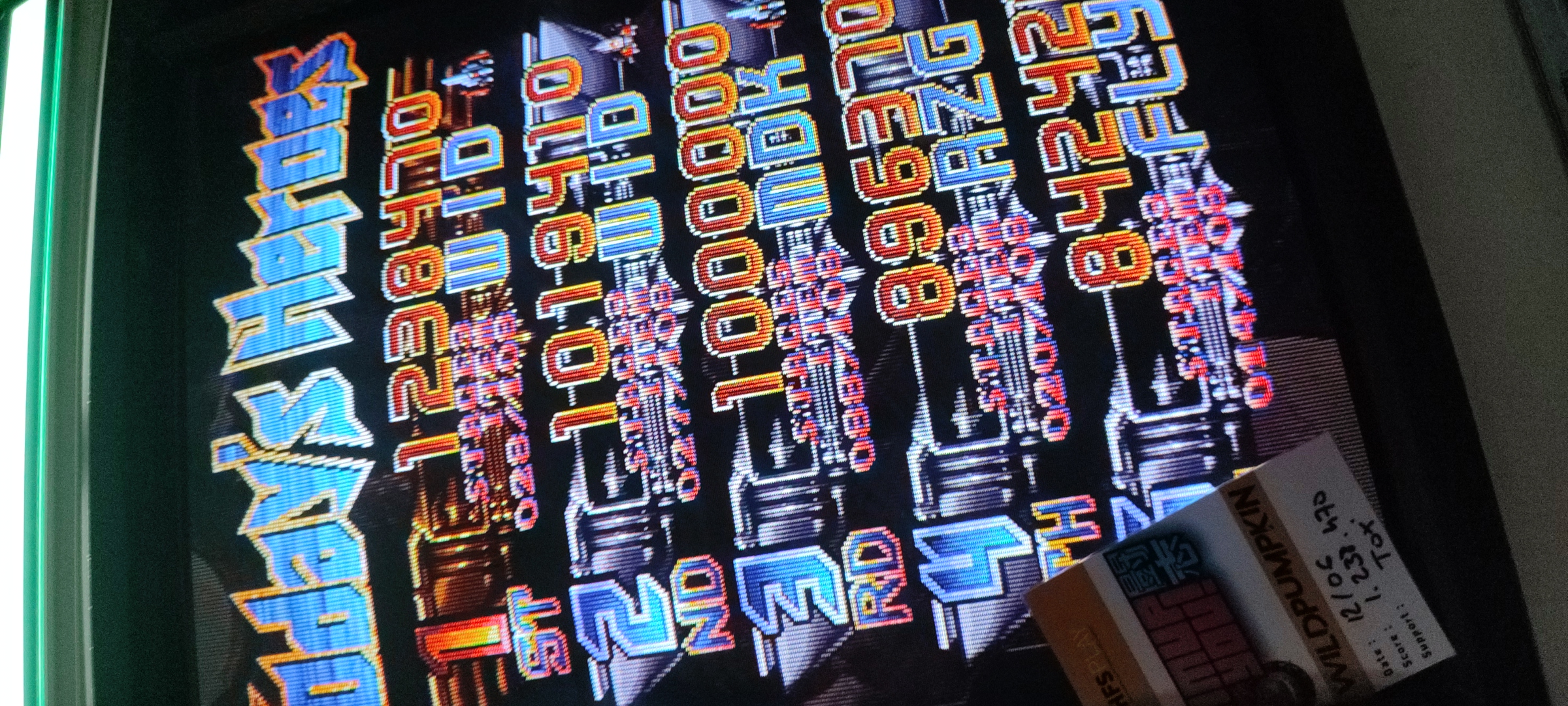 Je me suis motivé à repasser en Tate, mais c'est galère sur ces bornes la. Une fois fini, j'ai voulu corriger un peu l'angle donc j'ai enlevé l'écran à moitié et il a glissé et est tombé dans la borne... J'ai tout remis en place mais la neckboard a morflé et j'ai plus du tout de vert. Je suis pas digne de possèder une borne.