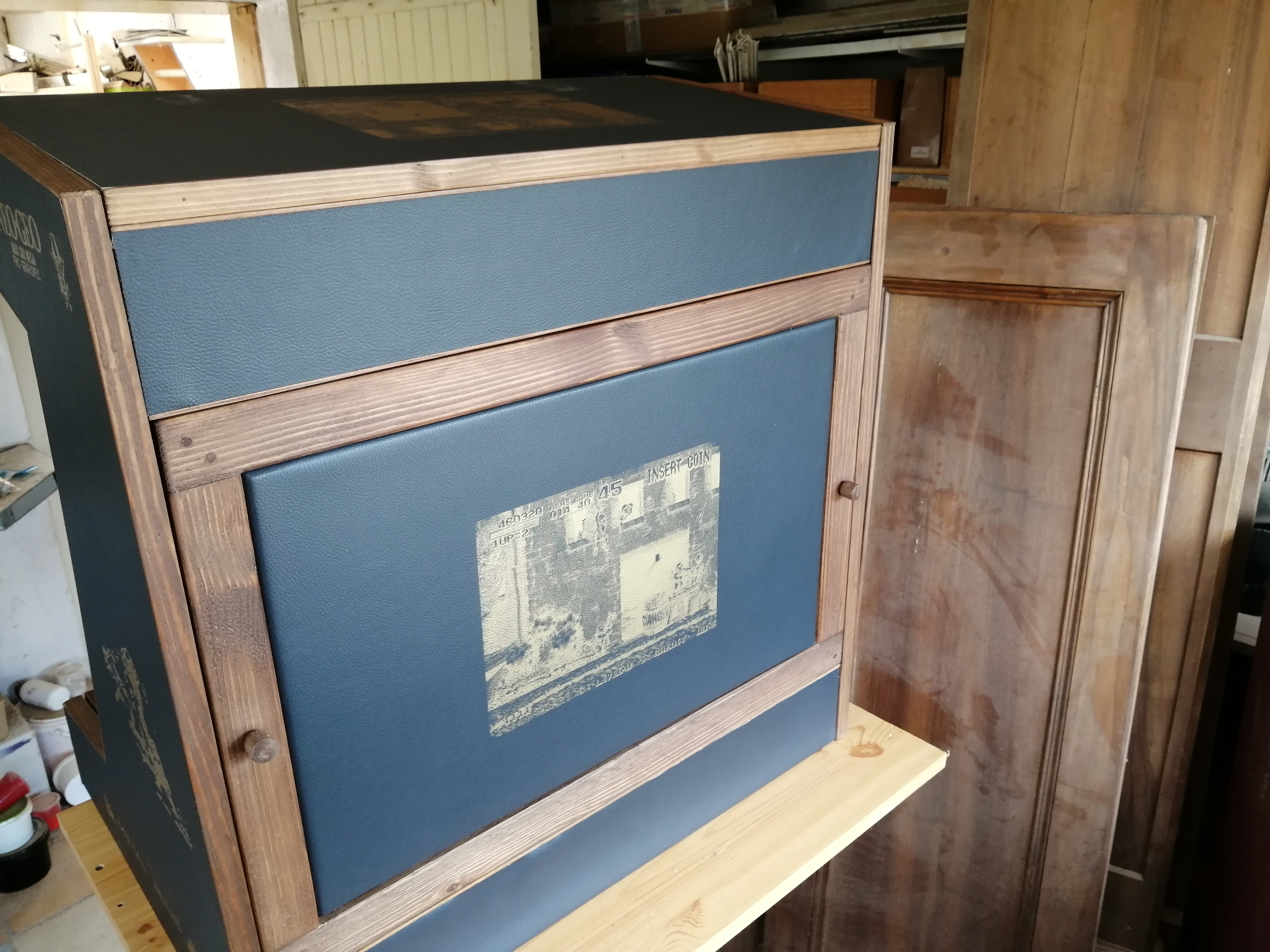 Bois / simili cuir et sérigraphie faite par mes soins sur les cotés et le marquee ainsi que la porte arrière ( petite image extraite du jeu métal slug )