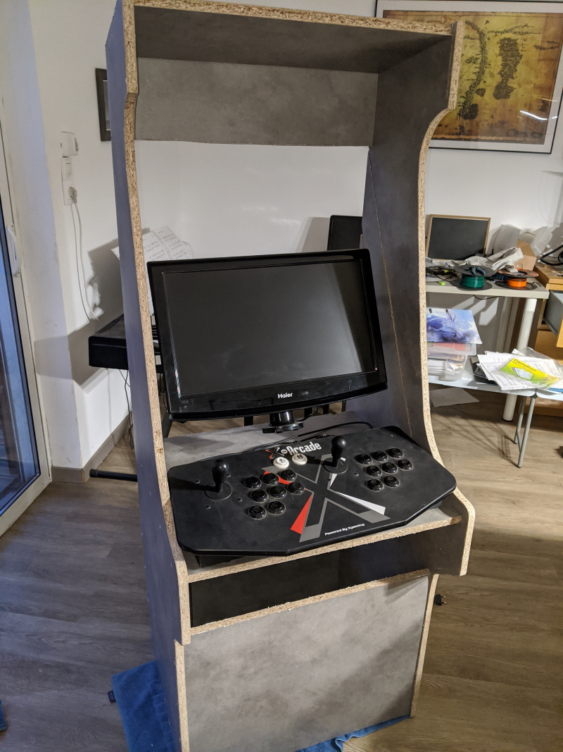 Je suis en attente de la livraison des stickers, et d'un peu de matériel pour réaliser le rainurage nécessaire à la pose du T-molding. Il faut aussi que j'avance un peu sur la partie électronique (qui consiste surtout à synchroniser l'alimentation du raspberry et de la télé, ou le switch entre mode arcade et mode retro-computing).