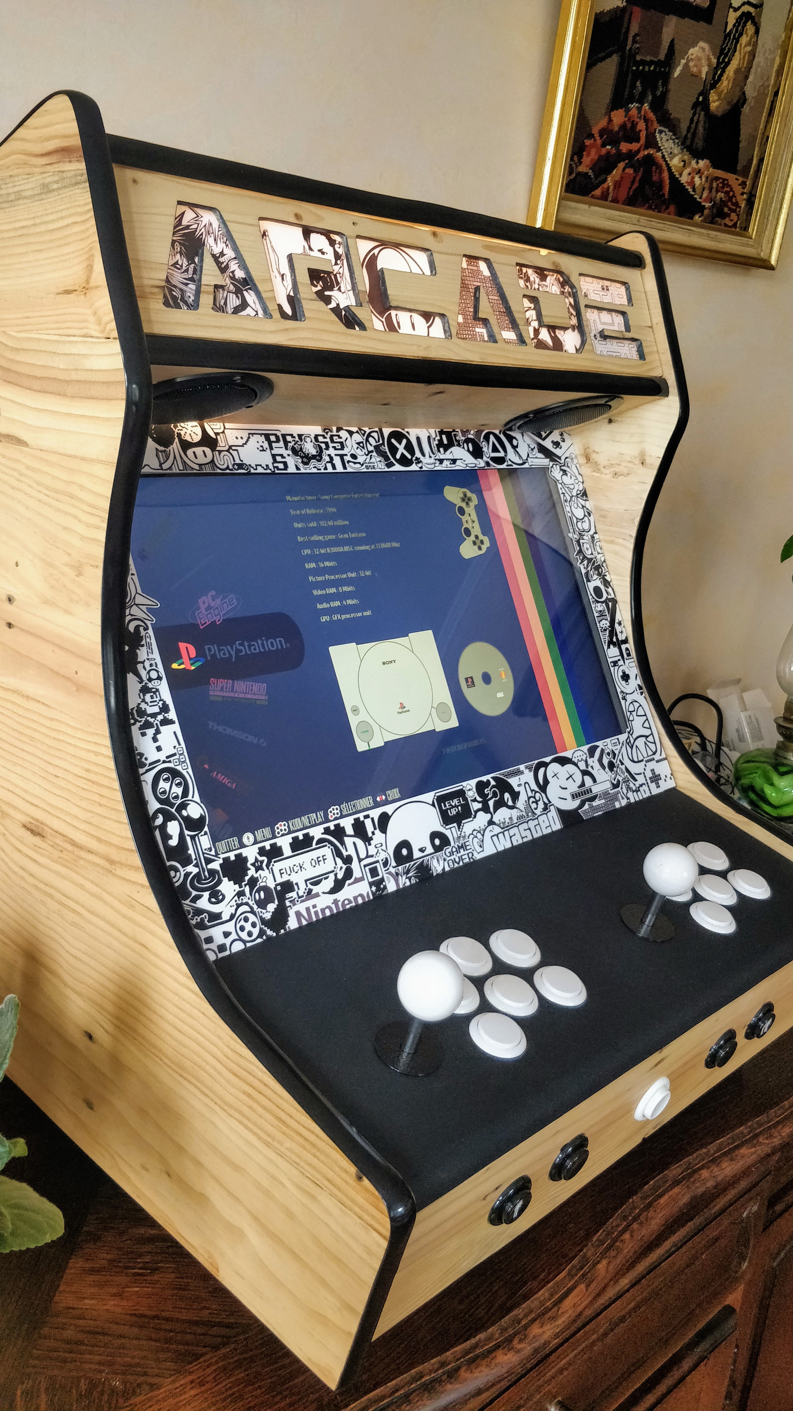 Pour le bois du contour de l'écran, il ne sert que de support et ne se voit pas à l'utilisation. Il provient d'un vieux tréteau en bois qui ne servait plus