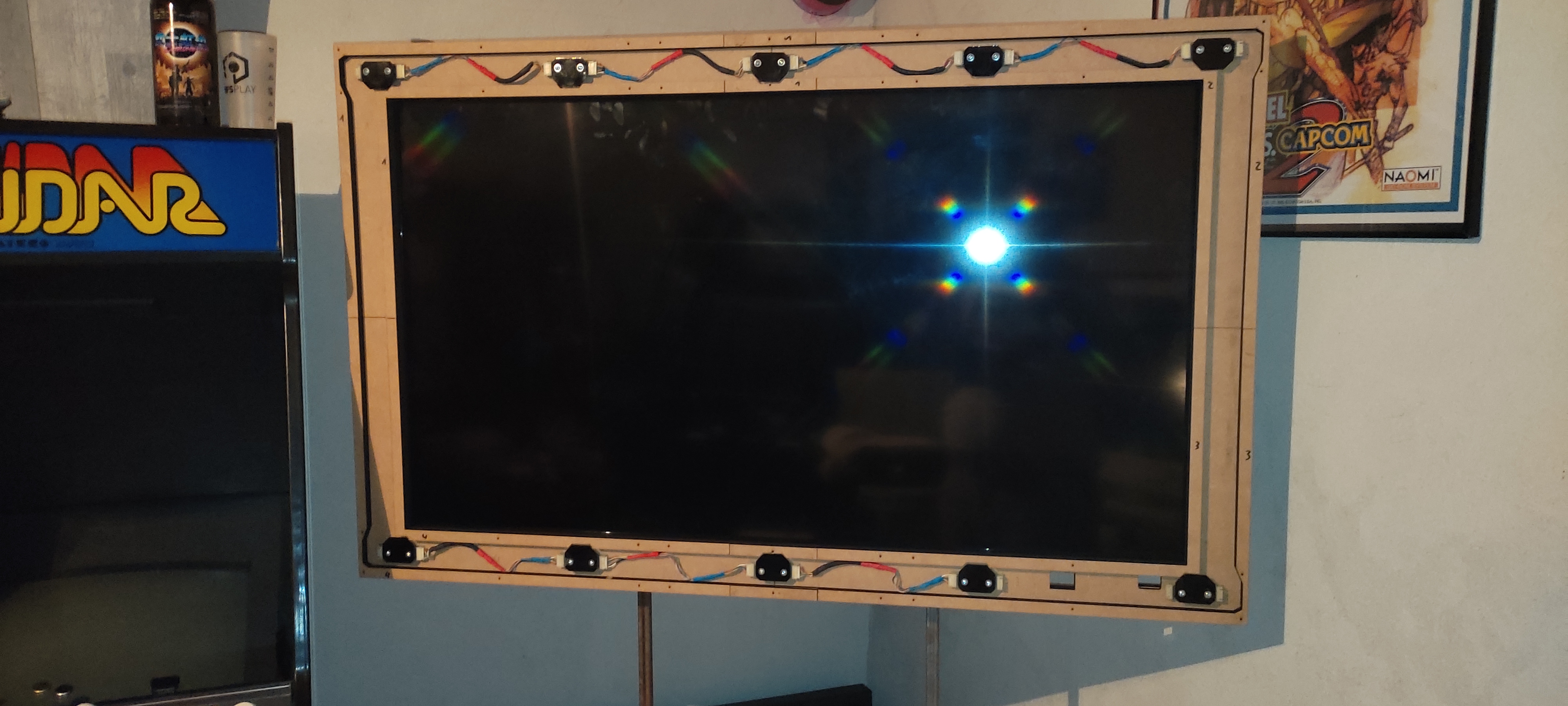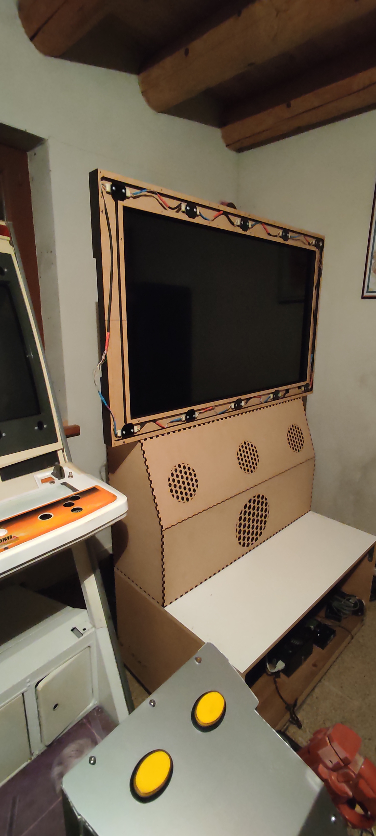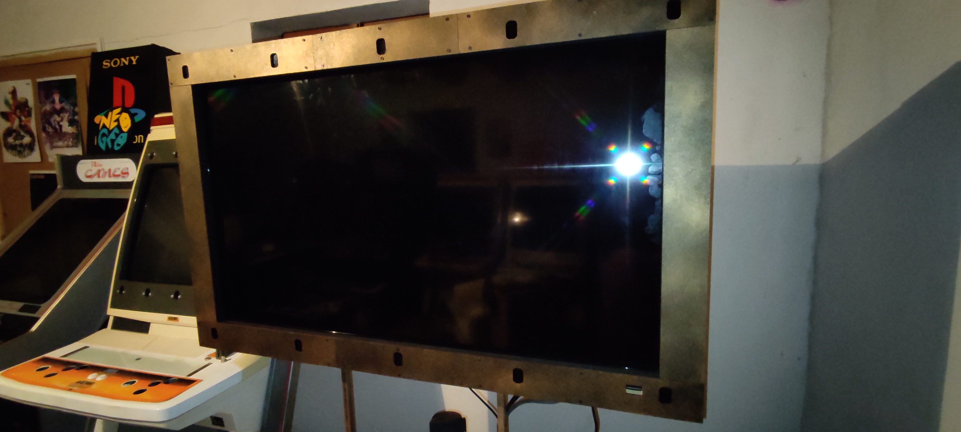 Après ça j'ai utilisé un ecran de 32 pouces 16/9 avec un bezel custom, posé a l'arrache sur des caisses. ça marchait mais c'etait pas ouf