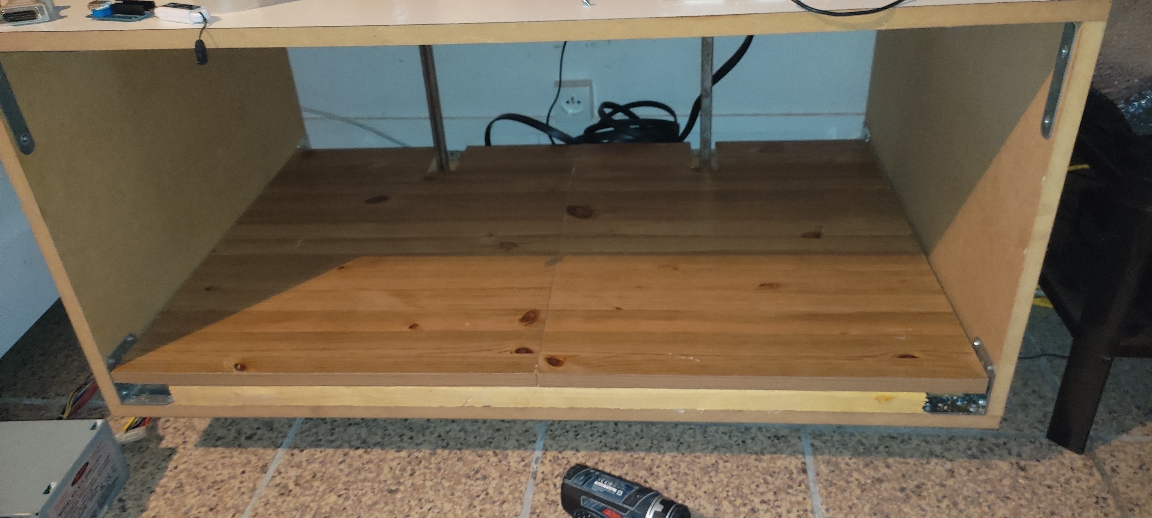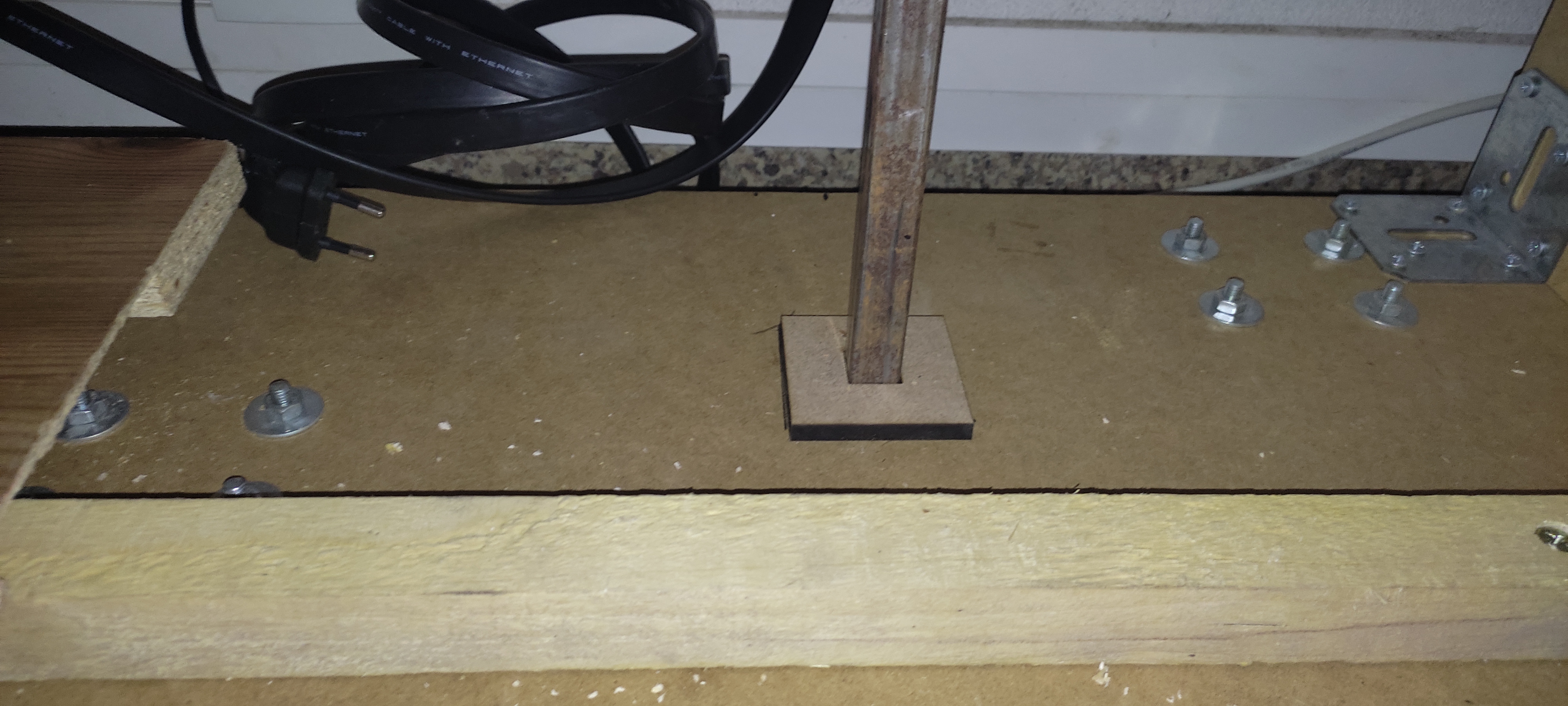 l'écran est boulonné au niveau des ports VESA dans deux tubes carré en acier qui sont glissé dans deux trous dans le haut du meuble, et une plaque les bloque dans le fond du meuble j'ai fais un fond de caisse, pour etre au dessus des boulons de fixation et avoir un fond un peu opti : 4 tasseau et des planches de recup