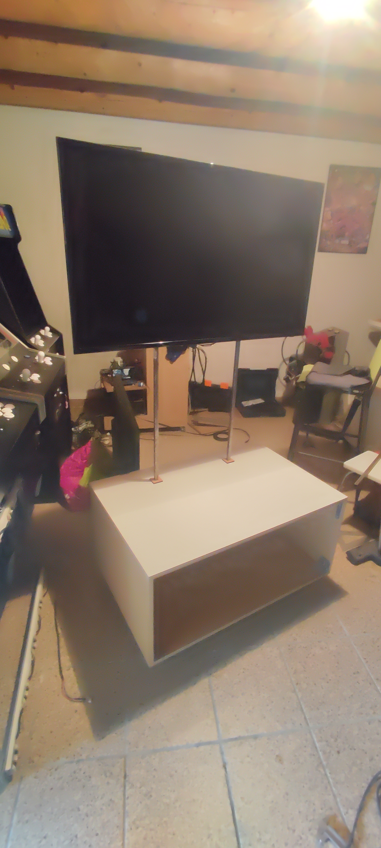 j'ai essayé d'utiliser un max de récup: tv 46 pouce du salon qui ne servait plus, le bois de la caisse du bas c'est de la récup, les barres métallique pour le support d'écran c'est pareil.