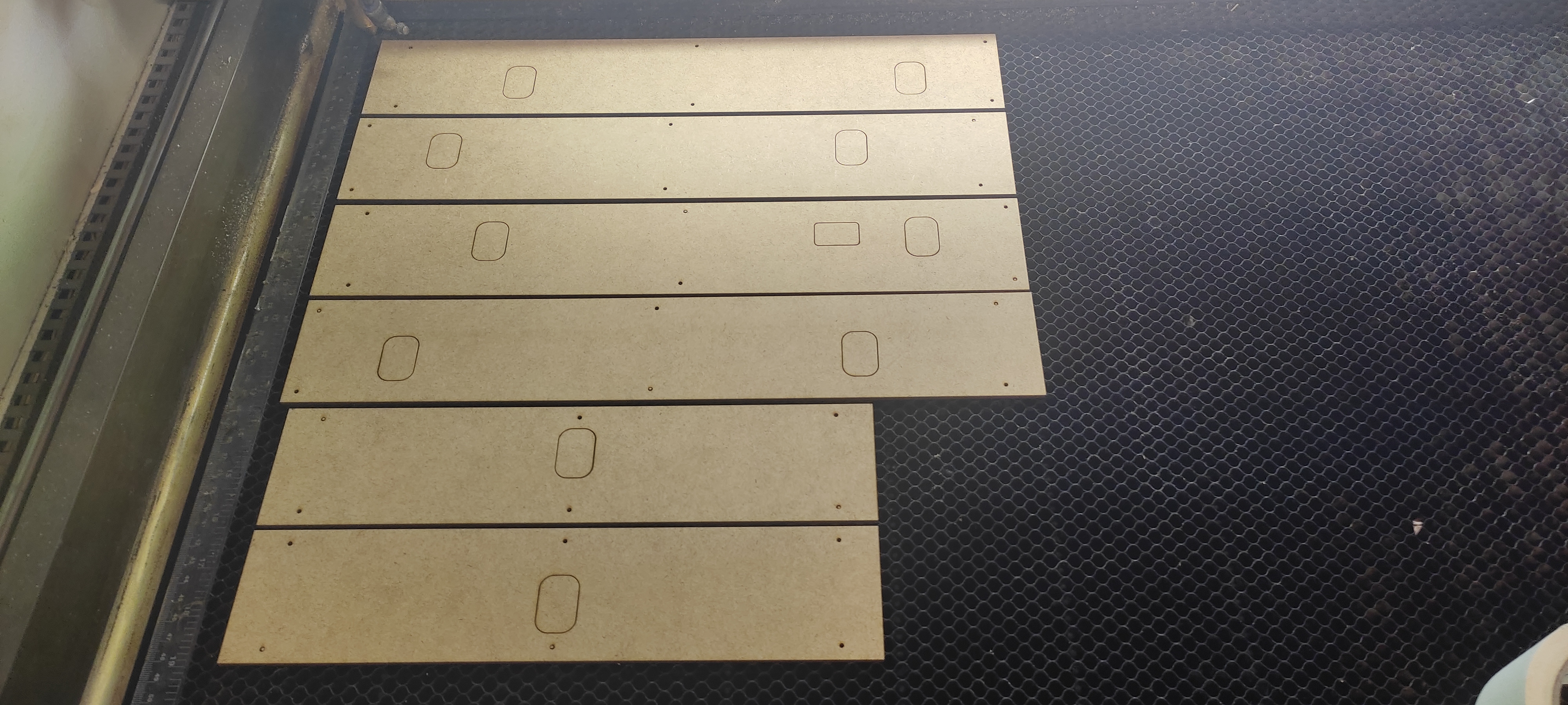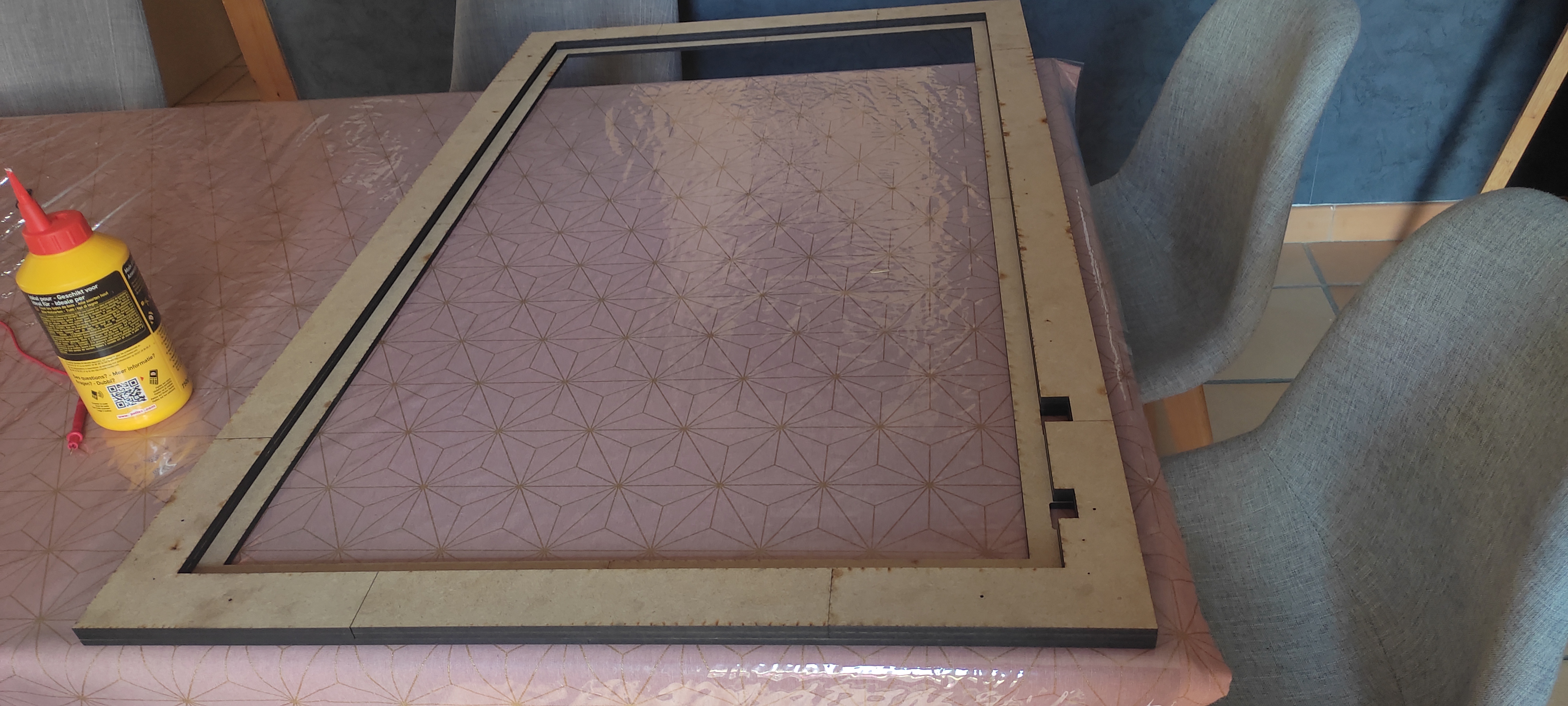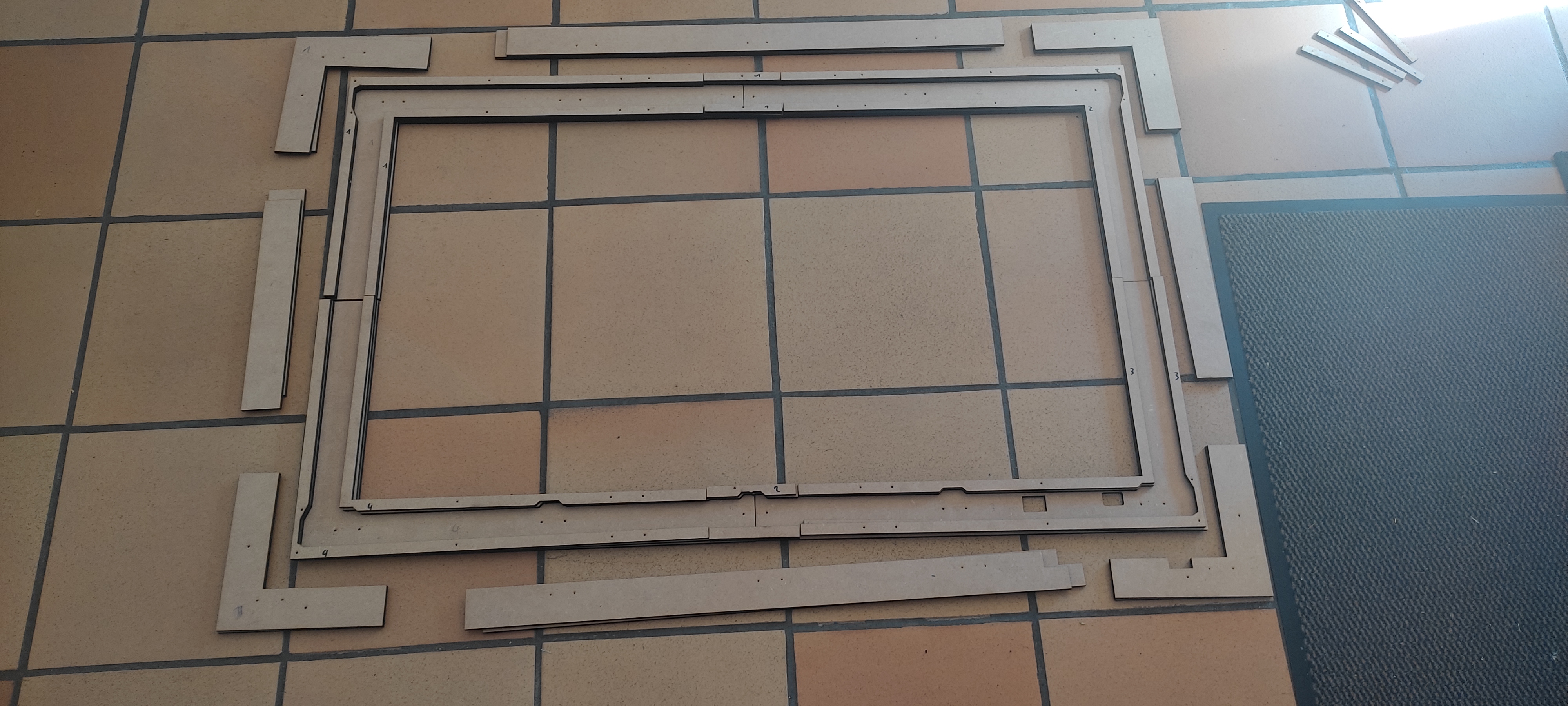 le bezel assemblé ressemblera a ça, c'est un ensemble de plein de morceaux que j'ai arrangé pour utilisé pour avoir le moins de perte possible dans mes panneaux quelques éléments après découpe avant le collage ça donne ça début de l'assemblage du bezel