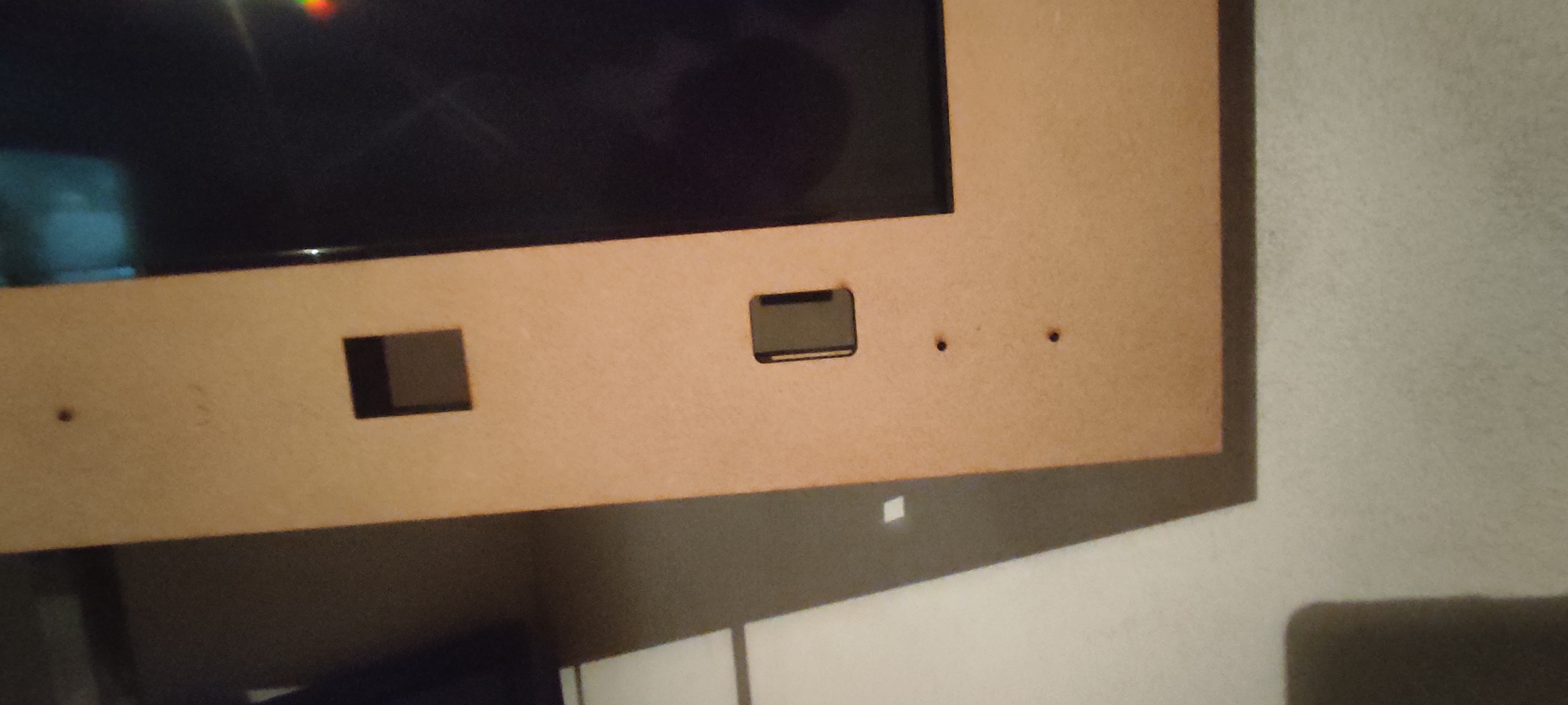 la vue arriere pendant collage la mise en place sur l'ecran : je ne me suis pas planté, j'ai 2 mm de rab autour de l'ecran, parfait pour le faire coulisser: inconveniant : ma tv ne doit pas crever vu que c'est prévu pour ce modèle! les 2 trous en bas sont pour pouvoir atteindre le capteur IR de la tv pour changer de source et l'autre pour faire passer le cable des émetteurs IR pour les guns une fois que j'etais sur que le bezel était designé correctement j'ai continué le collage des différents éléments