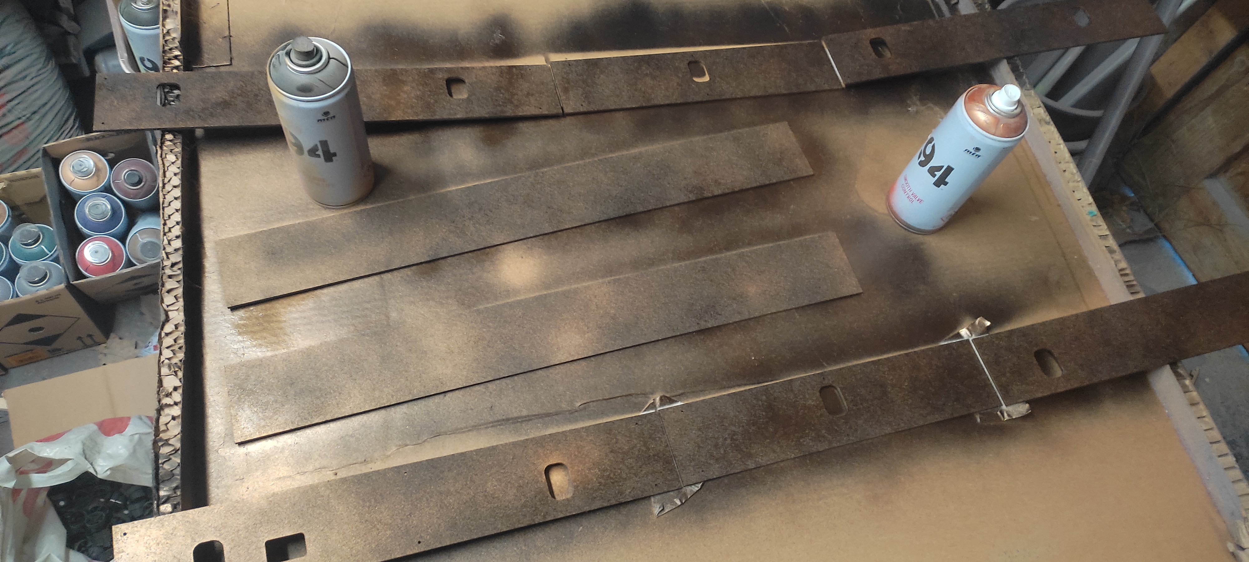 design, découpe et peinture de la face avant du bezel effet vieux metal avec un melange de noir et un voil de cuivre par endroit la photo est moche mais on voit les plaques en place, j'ai preferé opté pour plusieurs petite plaque pour limiter le démontage en cas d'emetteur hs, car oui ça aime bien crever le bezel est maintenant fini, il est temps de le tester avec un pti HOTD Scarlett Dawn