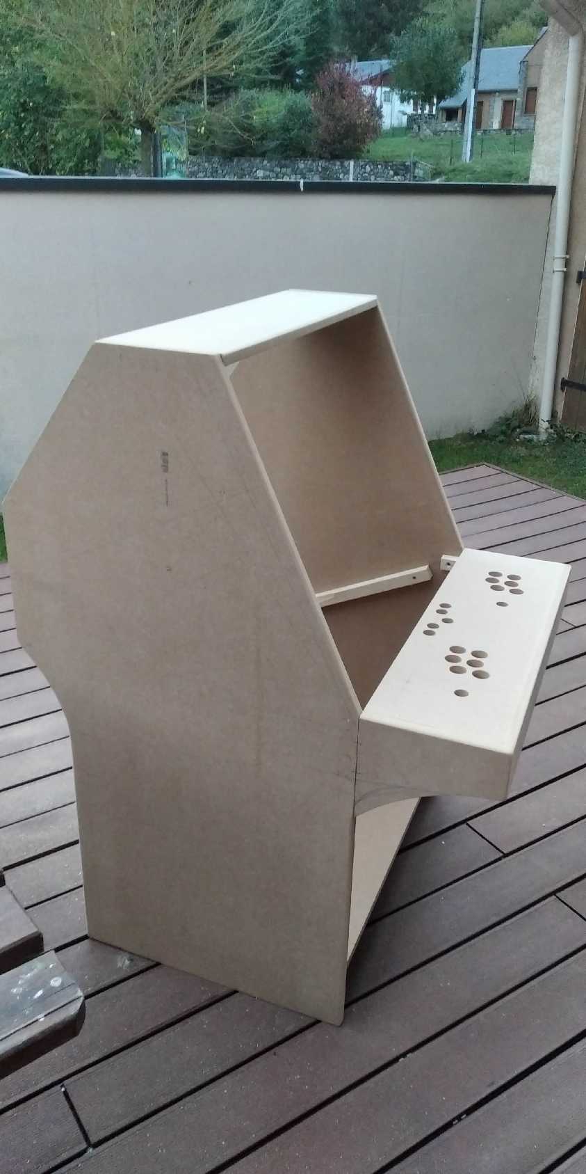 Je découpe, visse, ponce, passe un primer, ponce, passe une première couche de laque. Je câble et stick également le panel. Je n'ai pas encore fermé l'arrière de la borne pour y intégrer facilement la tv et pouvoir la caler j'en suis donc là: