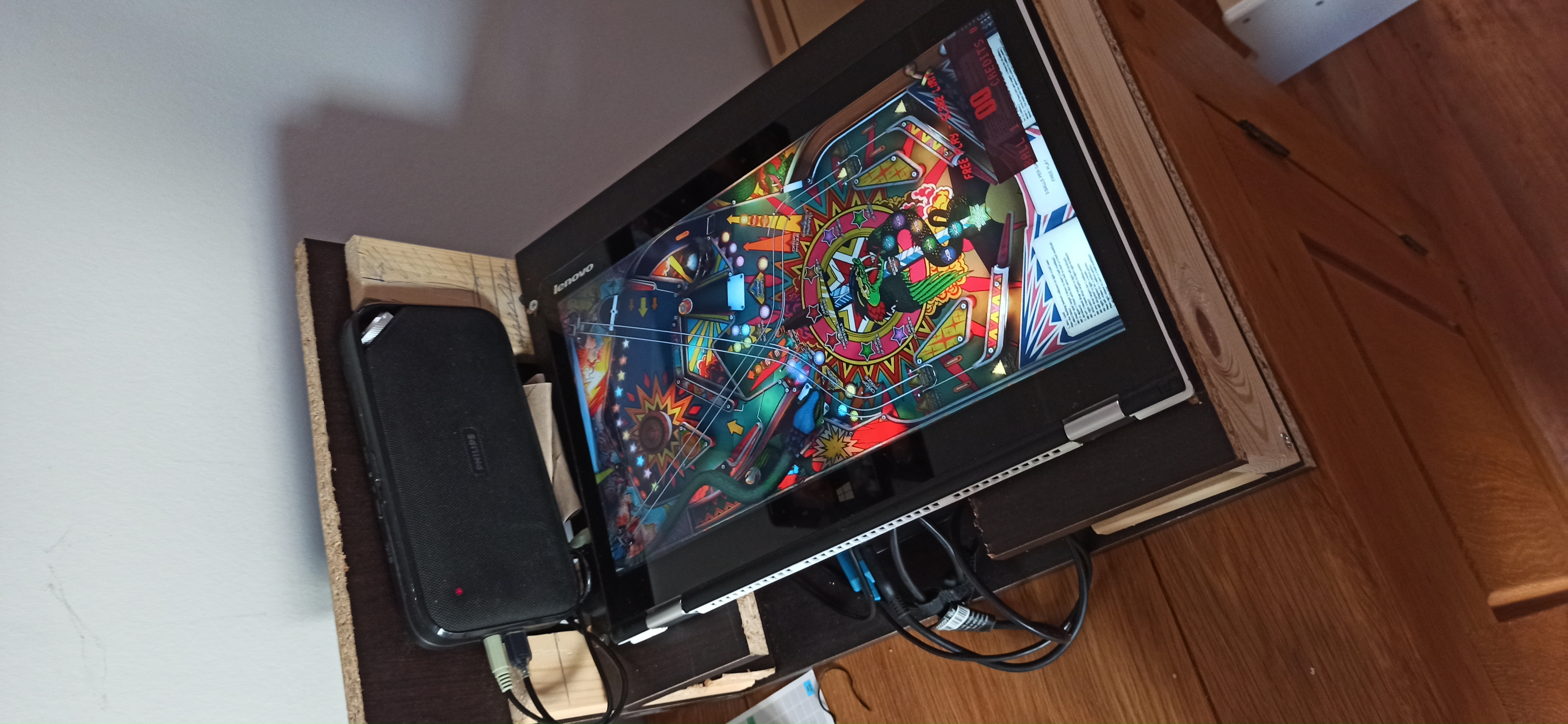 Je récupére à la cave une étagères cassée et fabrique un socle pour le PC. Une un vielle enceinte Bluetooth pour le son et test logiciel concluant. L'écran tactile sera ideal pour naviger dans les menus Le fond de l'étagère pour faire le cache et la porte decoupée pour les côté. Le lendemain matin je perce les troupes pour les bouton et peint tout en noir avec un reste de vitrificateur à parquets. Je galère à enfoncer les boutons car je n'ai pas le bon outil pour les trous. Je decoupe la semelle d'une chaussures foutue pour faire des patins antidérapant et éviter que le fond s'abime à force de frottements. Mais voilà j'ai réussi à faire un mini pincab jouable en un temps très court sans dépenser un euro. C'est plein de défaut et ça meriterais un peu de deco, ça m'a surtout juste donné envie d'en refaire un plus tard avec du budget et en prenant mon temps.
