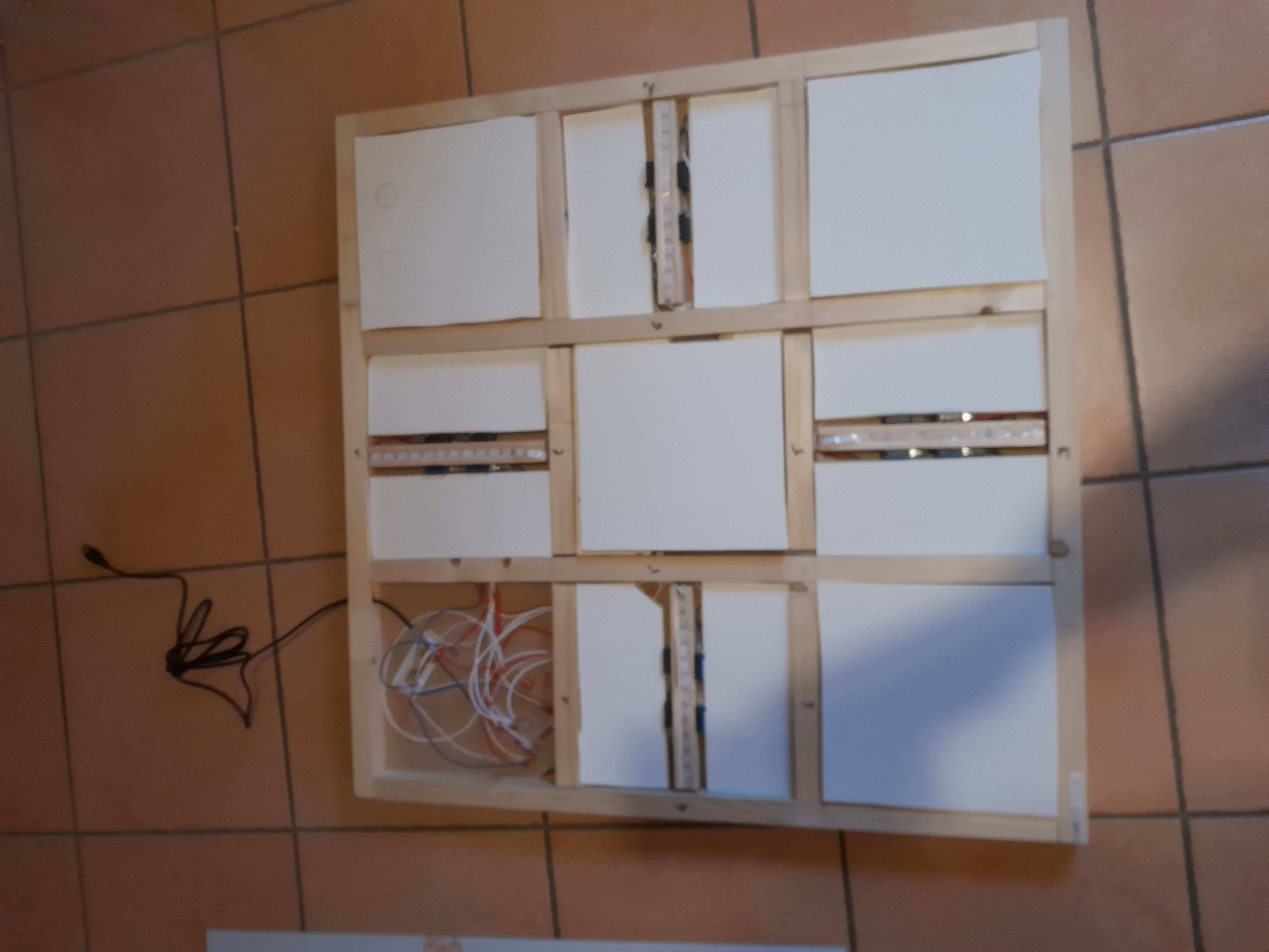 Je commence par les tasseau et la base en 2 plaques car j'avais des chutes au garage (81x81 mdf 9mm, tasseau 28mm et 25mm), tout est vissé par le dessous. J'attaque les tasseaux pour la partie éclairage et touche de jeu. Il y a donc 2 microswitchs par côté, un côté pour les commandes l'autre pour actionner les leds, les microswiths sont collés puis vissés. Plus beaucoup de ruban led au garage je me contente d'une simple ligne au lieu de la case entière, je fais donc une grosse rainure sur les tasseaux pour intégrer la led. Je découpe des chutes de dalles de plafond isolantes pour les cases vides. Ensuite je colle les tasseaux à la néoprène, je câble sur la carte usb joystick. J'ai décidé d'utiliser une plaque de polycarbonate de 3mm entière je pense que ça fonctionnera également. J'ai prévu 4 boutons parce que j'ai déja les jeux DDR sur psx qui tourne via recalbox, donc je veux pouvoir valider avec le pad et aussi sortir du jeu (A,B, select et start donc)...mais j'ai testé stepmania hier soir (sans le pad) et je pense que je brancherai plutôt mon pc que recalbox au vidéoprojecteur !