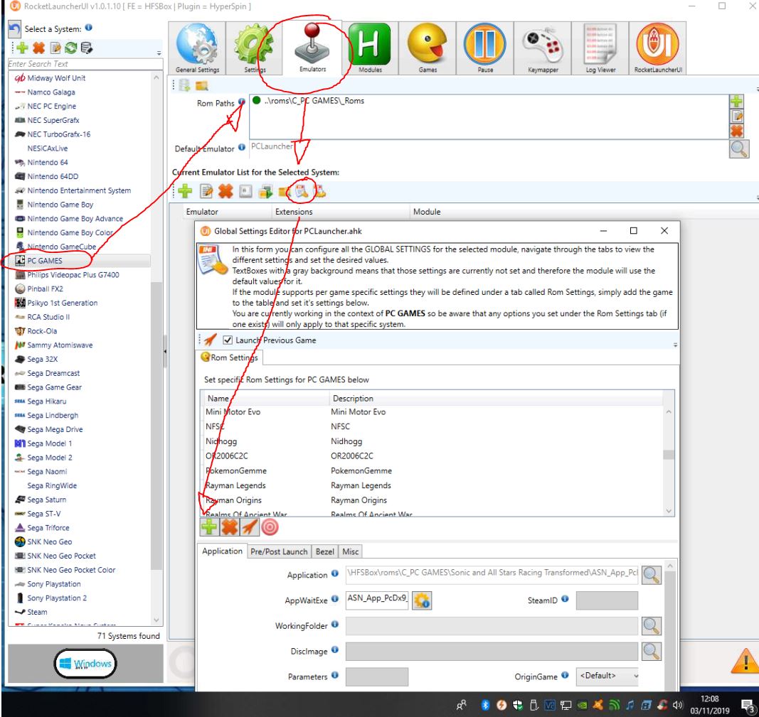 Sélectionnez l’émulateur PC Launcher, puis le ou les dossiers contenant vos roms (certains ce lancerons depuis un exécutable, d'autre via un raccourci),