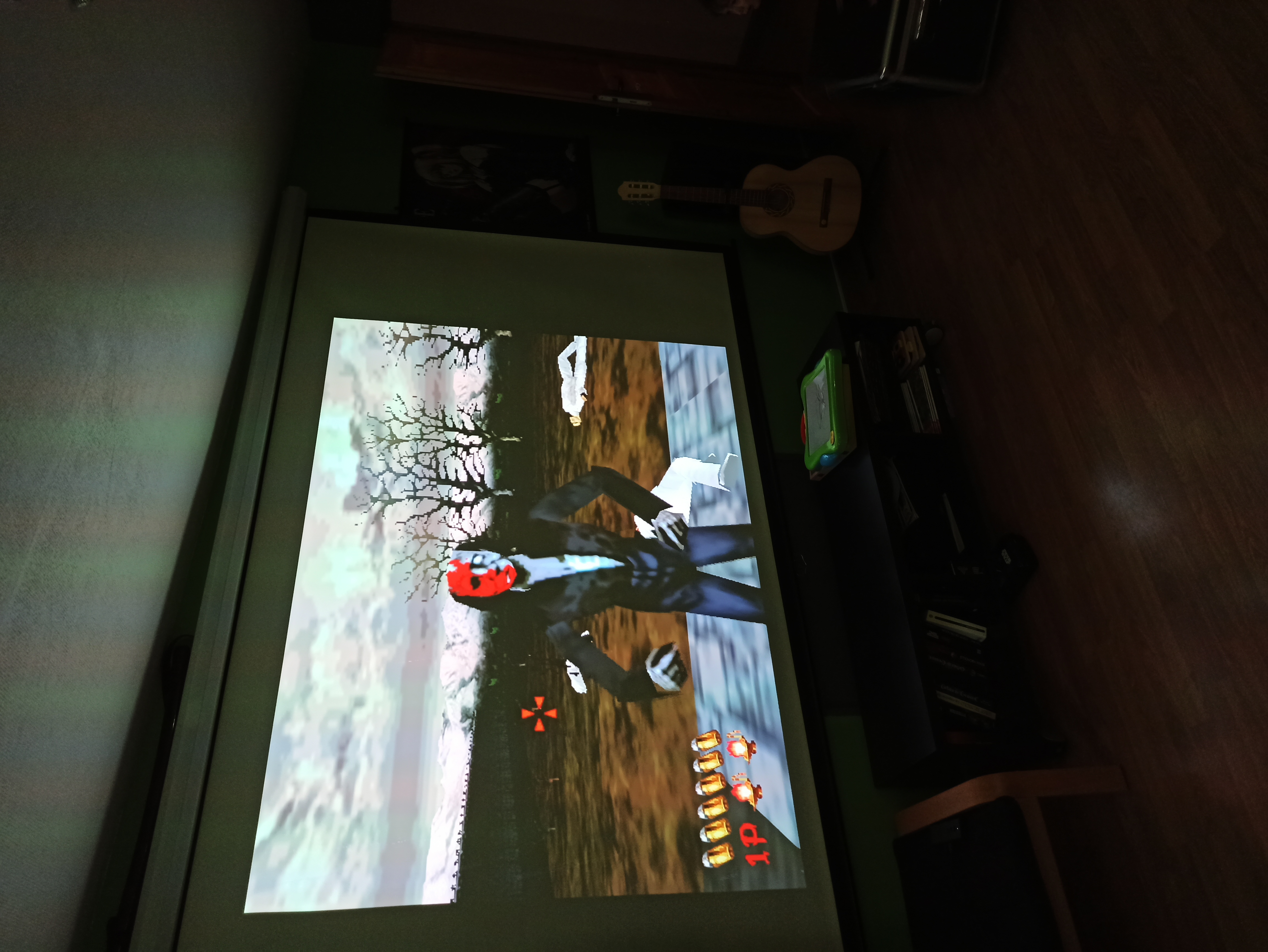 Par contre dans mon bureau, je suis équipé d'un pc puissant qui pourrait faire tourner n'importe quel rail shooter, et d'un vidéoprojecteur avec un écran d'un taille confortable (3m de base)