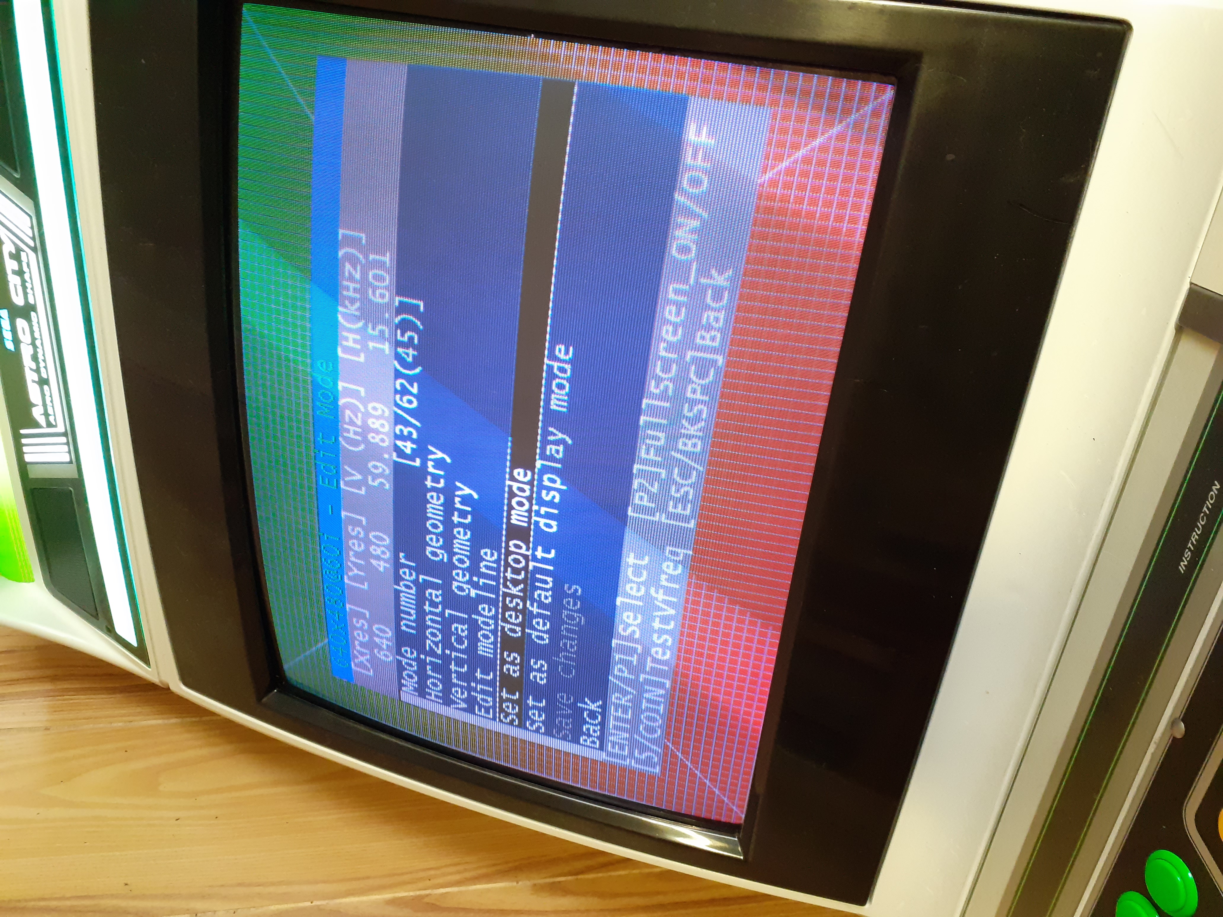 Ma carte graphique est une ATI Radeon HD 4550. Je suis débutant mais j'ai trouvé un tuto me disant de passer par l'onglet Arcade OSD dans ma box. Il m'est dit de changer la mauvaise résolution qui lorsque j'arrive dans le menu est sur 720x... (je ne sais plus combien exactement), d'appuyer sur "set as desktop mode" ( je le fais même sur "set as default display mode") et d'ensuite appuyer sur "keep" pour garder ce changement.