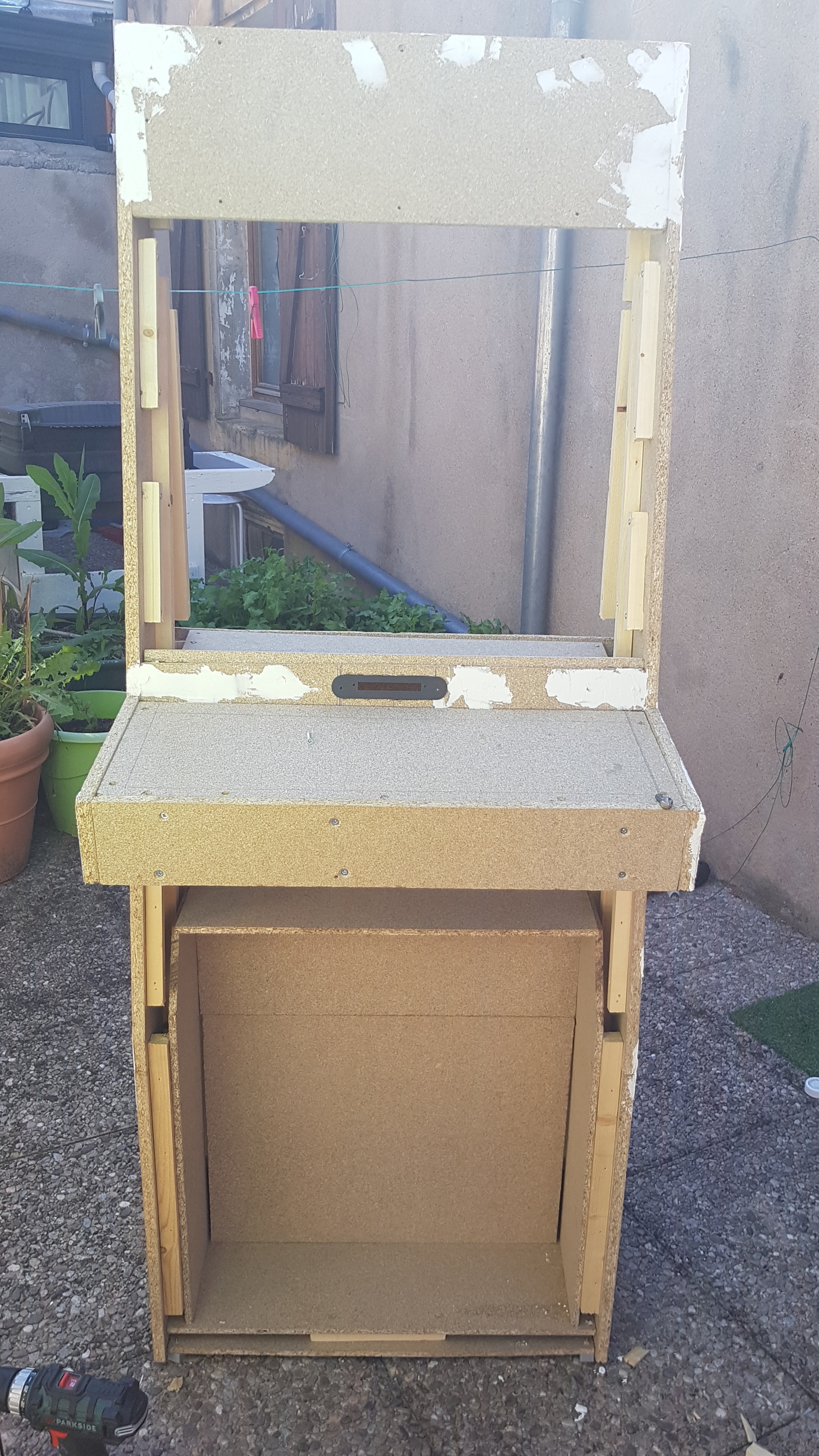 Une fois poncé, encoller, je fais un essai de mastique de chez Action (la Mecque du maker creuvard). Puis ponçage de nouveau et enfin peinture !