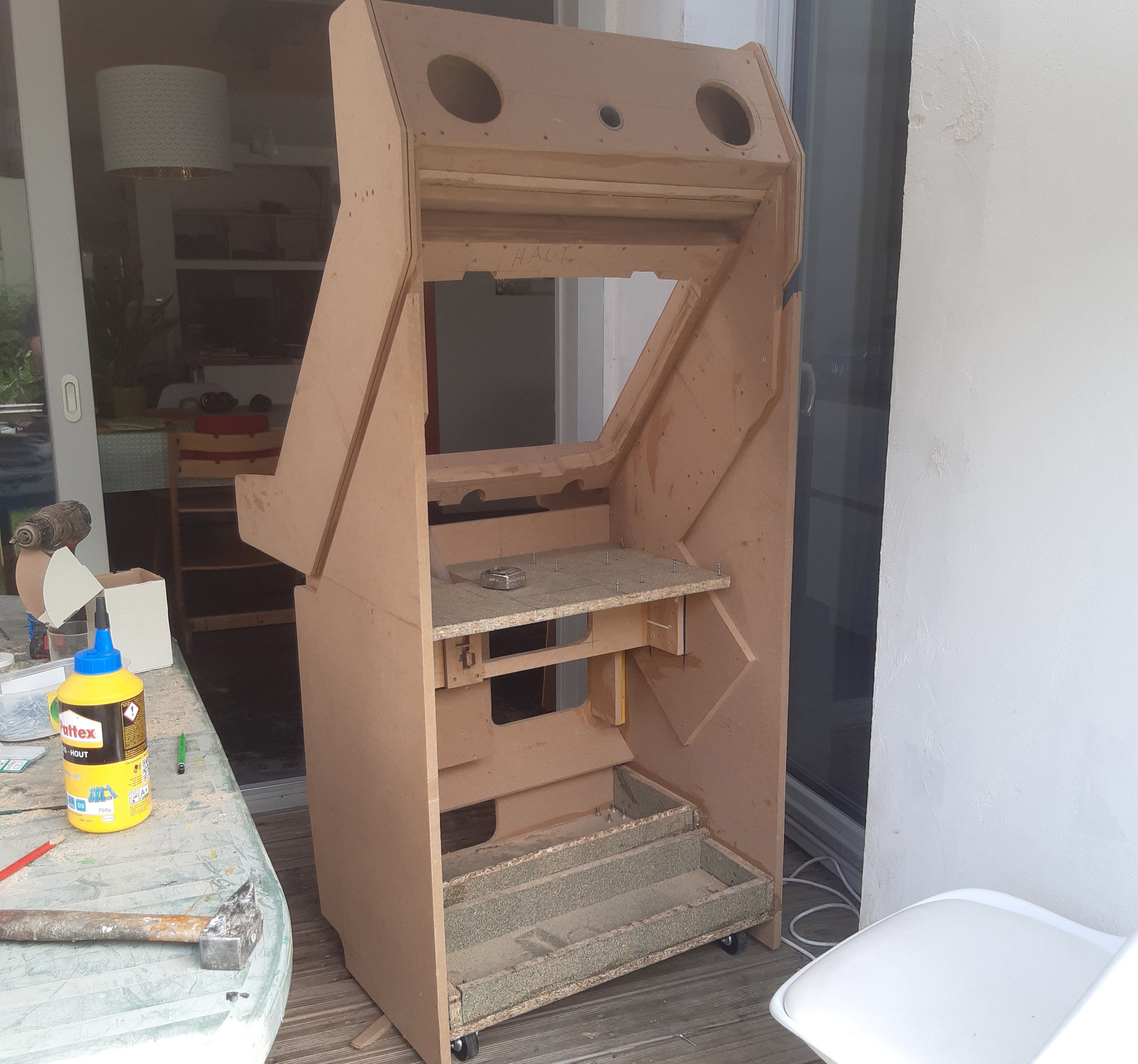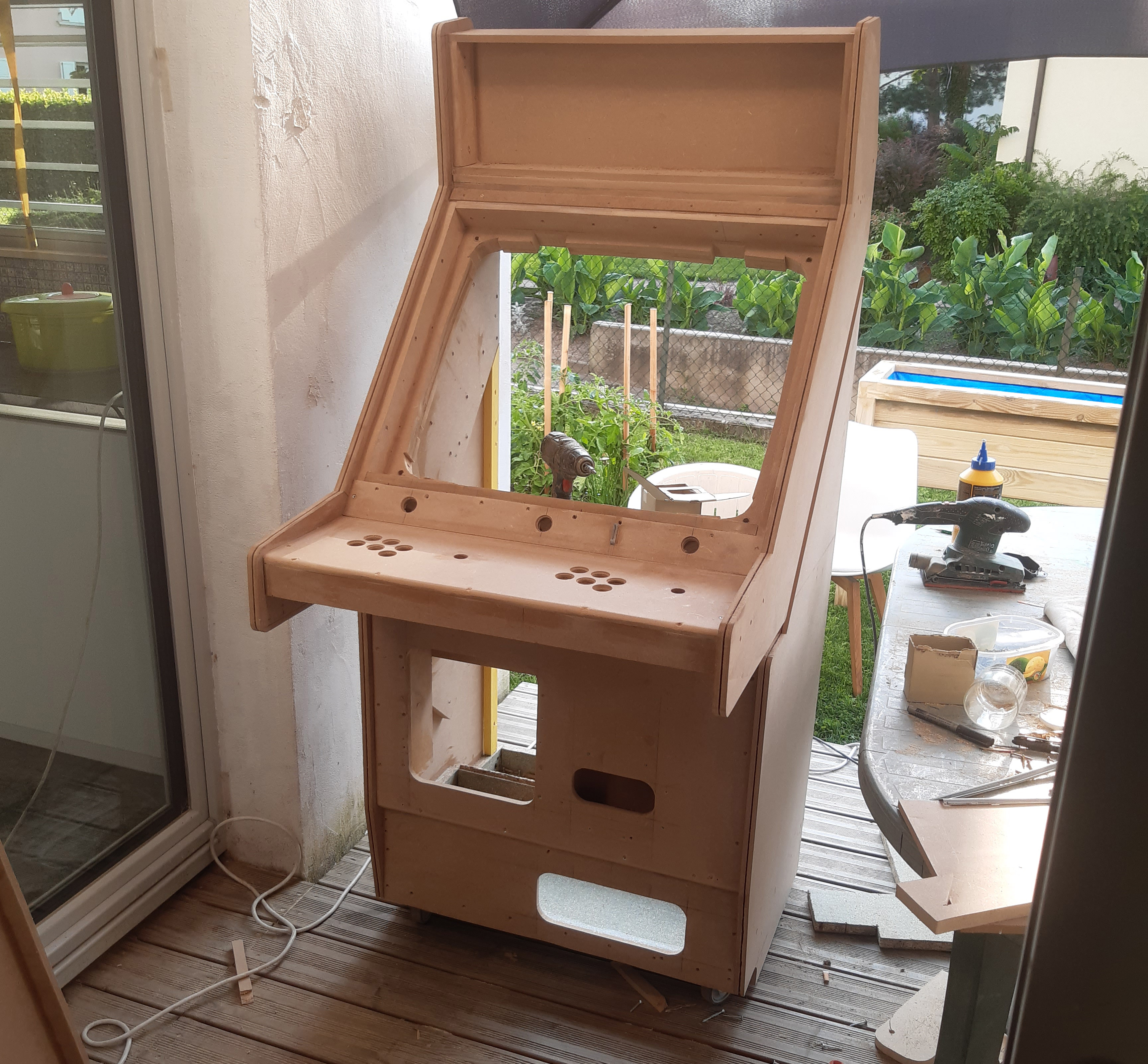 Mais ca représentait trop de boulot et des compétences que je n'ai pas (soudure de l'acier), donc n'étant pas certain de parvenir au résultat que j'avais dans la tête, j'ai préféré pour cette première borne faire au plus simple.