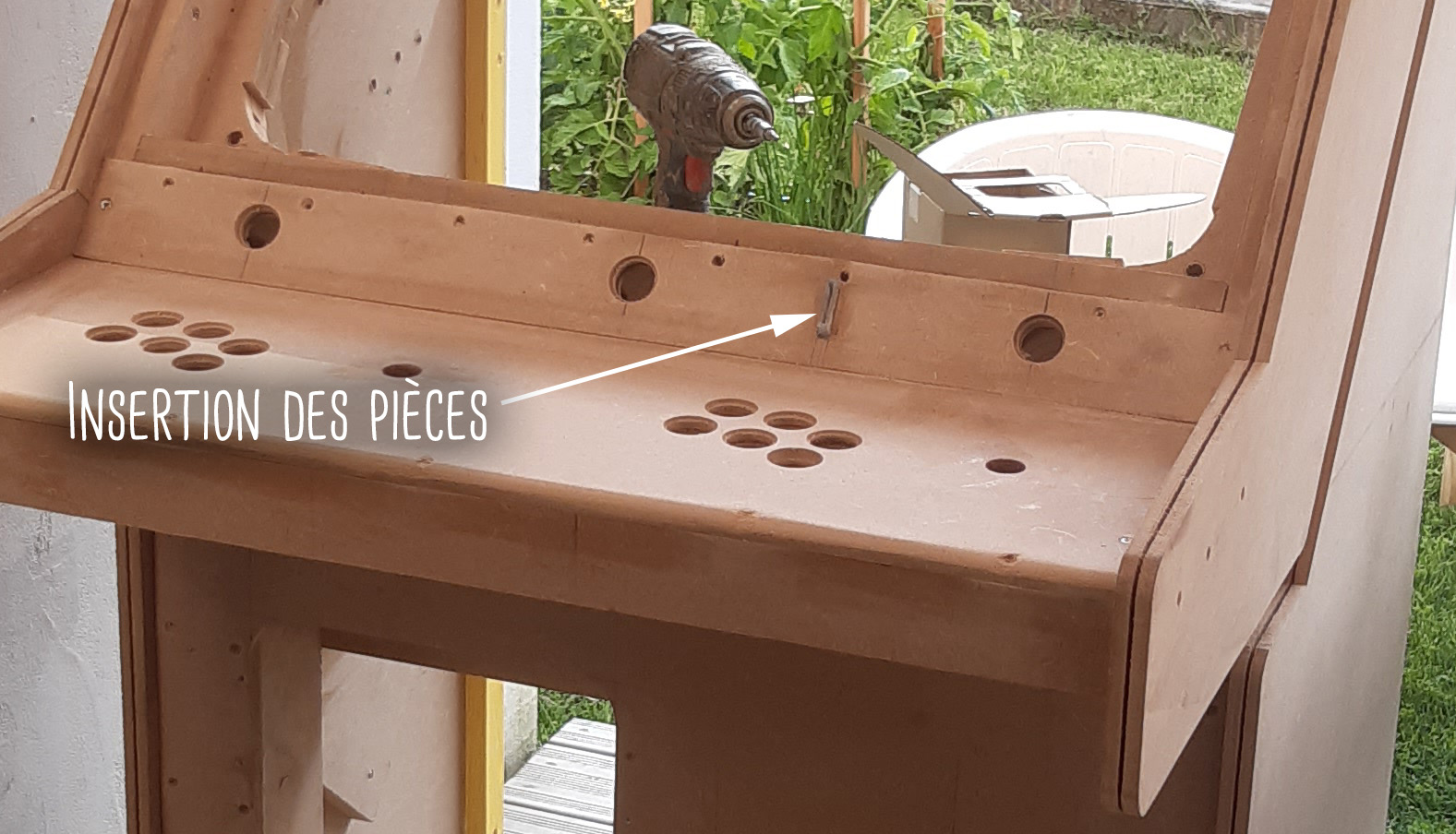 Je ne voulais pas une insertion de pièces en façade mais sur la façade de l'écran pour éviter d'avoir à se baisser à chaque fois que l'on veut alimenter la bête.