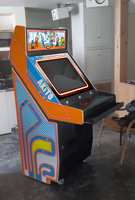 Petite essai / mise en situation de la borne avec ses stickers. Je voulais quelque-chose qui ne ressemble à rien d'autre. Les inspirations sont claires : N'Styl et Taito.