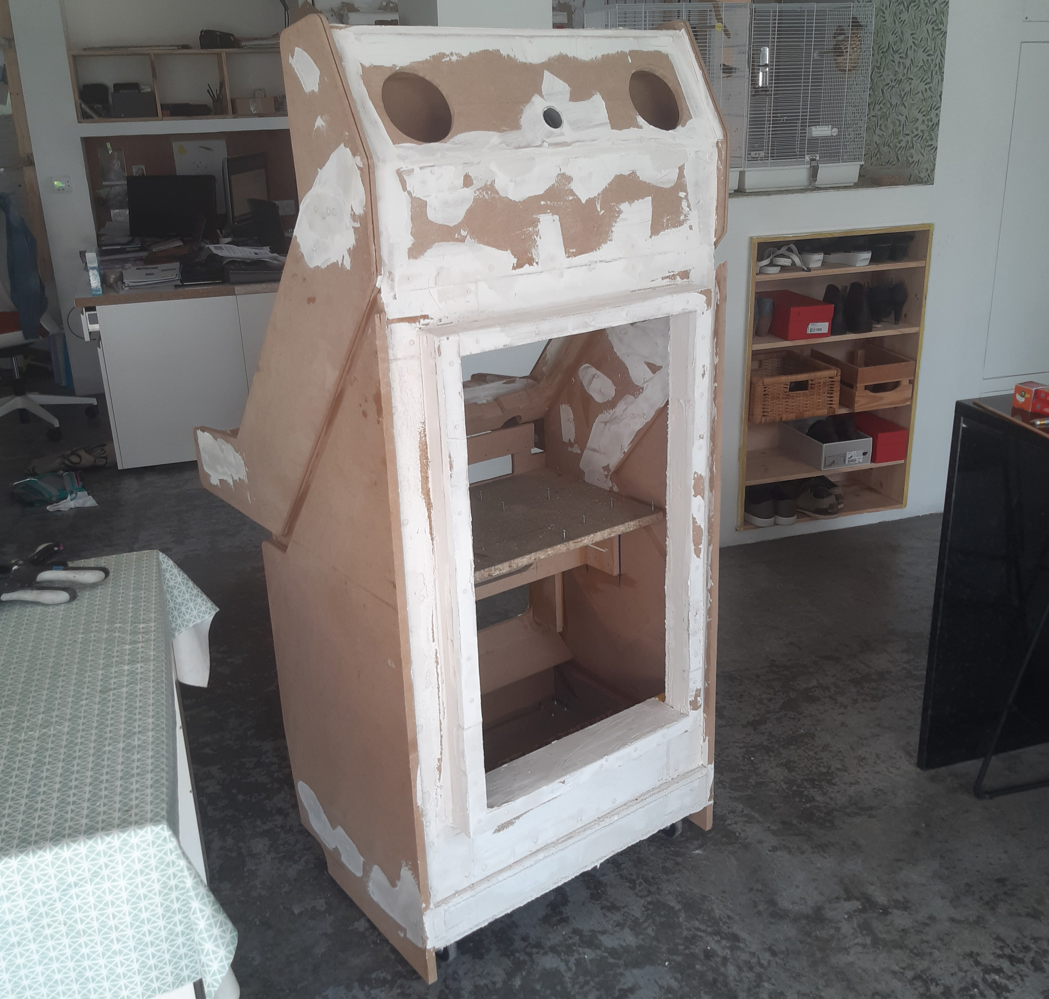 Mais ca représentait trop de boulot et des compétences que je n'ai pas (soudure de l'acier), donc n'étant pas certain de parvenir au résultat que j'avais dans la tête, j'ai préféré pour cette première borne faire au plus simple.